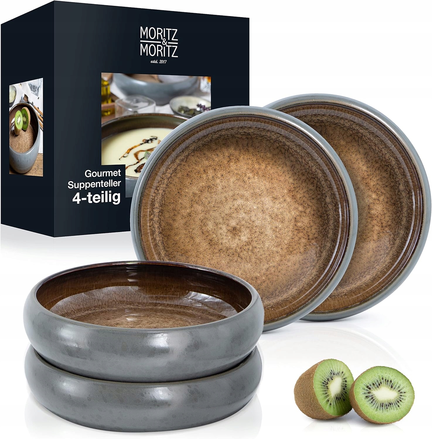 - Повний набір - Moritz & Moritz 4 миски з кераміки, кожна діаметром 19 см і висотою 5 см для супу місткістю 350-800 мл, всередині бежева, ззовні сіра, можна мити в посудомийній машині та багаторазове використання в мікрохвильовій печі