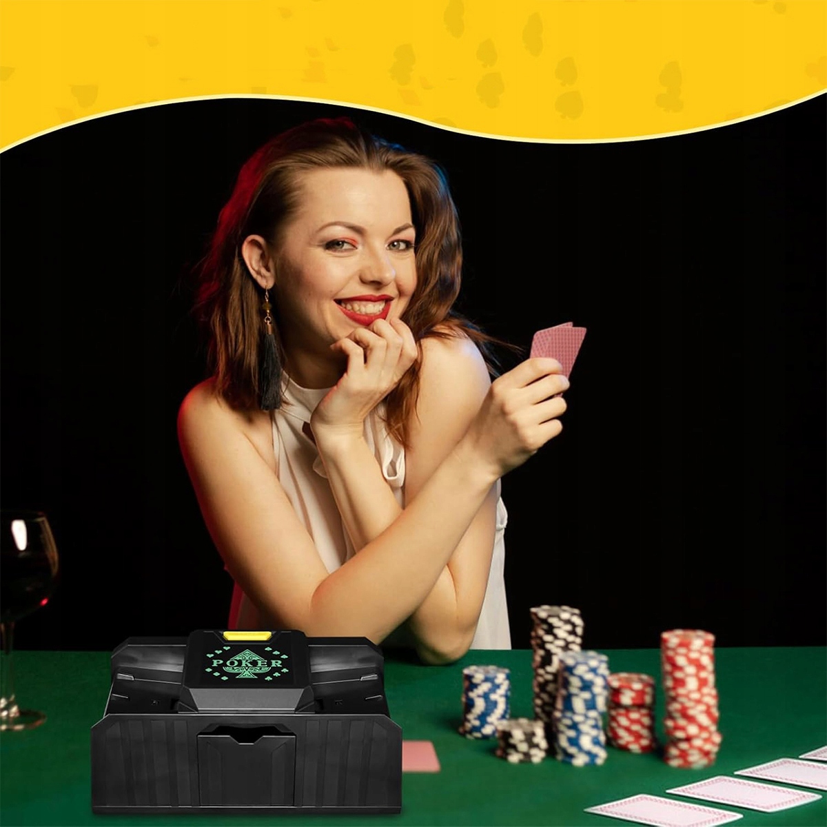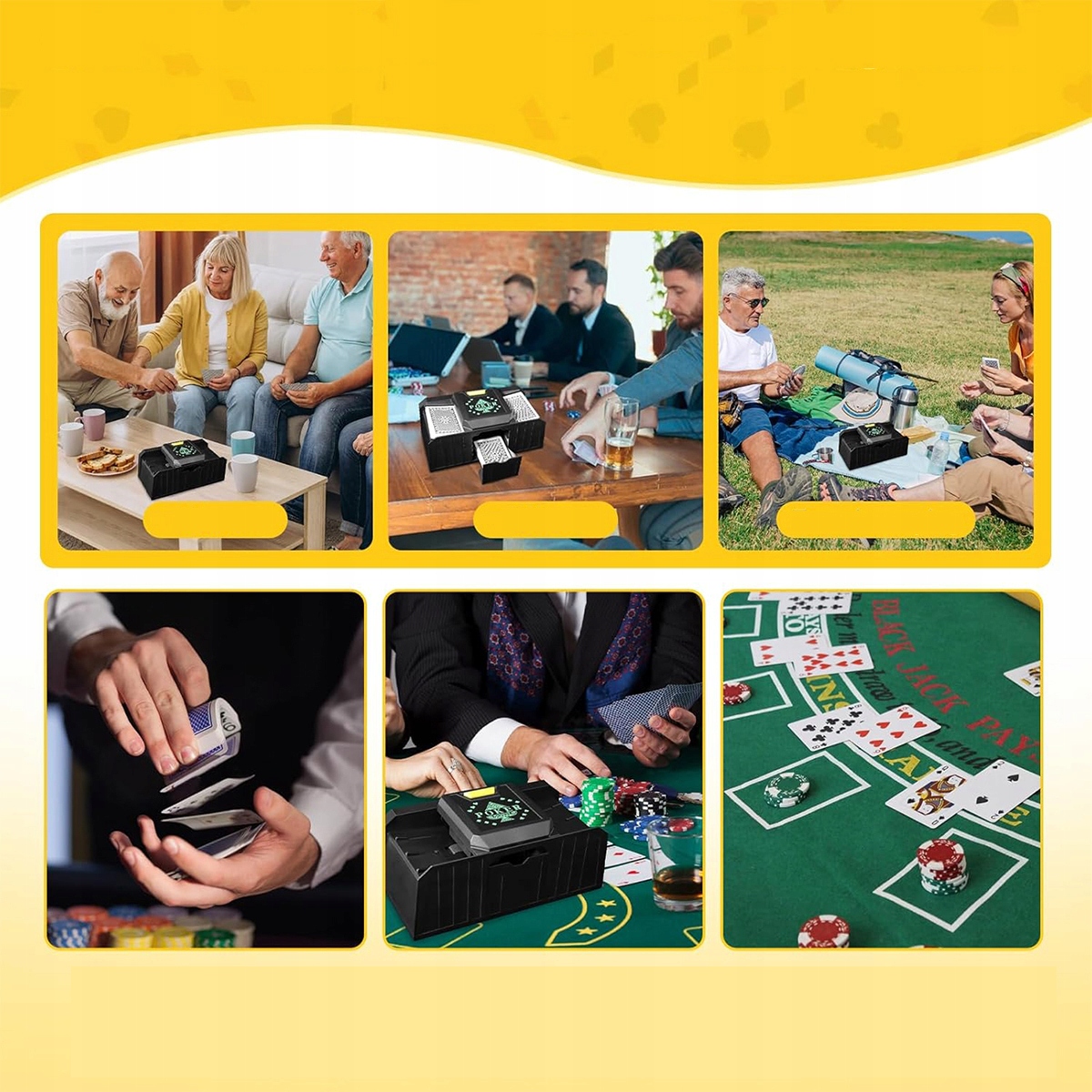 - Цей автоматичний тінер може вмістити до двох колод карток одночасно. Максимальний розмір перетасованих карт становить 9,7 х 6,5 см, що підходить для більшості типів карт, таких як покер, Texas Hold'em, Blackjack тощо