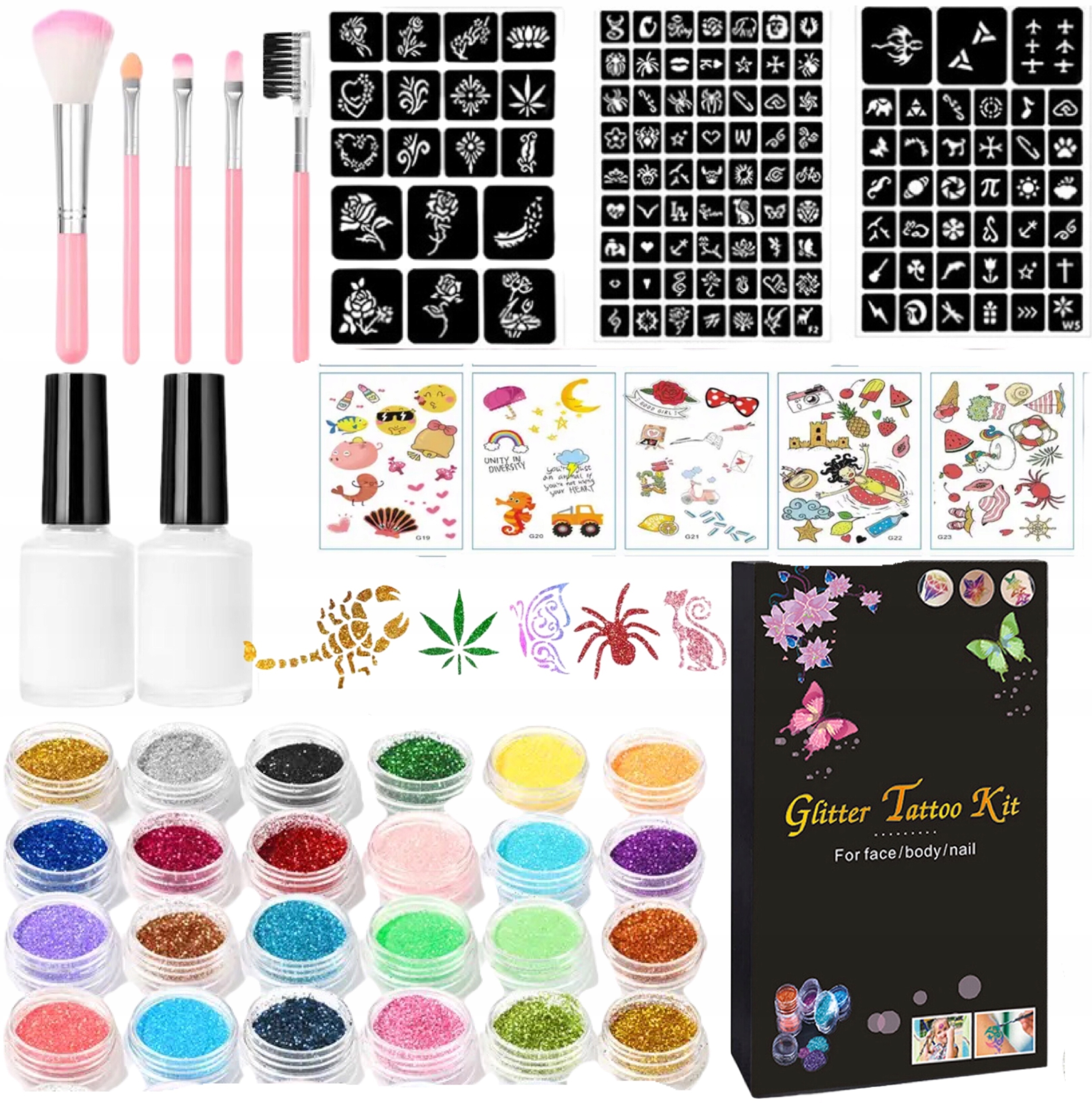 Набір для татуювань із блискітками та водними татуюваннями своїми руками містить усе необхідне для створення чудового боді-арту. Його можна використовувати на вечірках, фестивалях, днях народження як додатковий атракціон або просто для щоденного використання!