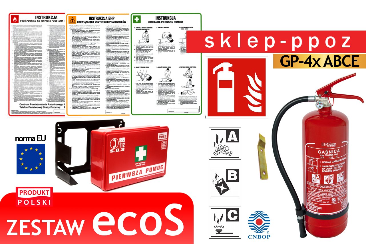 ecoS SET - економічна версія вже відомого набору S - розмір вогнегасника (4 кг вогнегасника) в наборі підібраний для невеликих і середніх офісів, приміщень площею <=200 м2. комплект укомплектований аптечкою к1 призначеною для надання першої допомоги (склад аптечки відповідає стандарту DIN 13164). Набір також містить необхідне маркування вогнегасника та основні інструкції: у випадку пожежі, застосовні до всіх p>