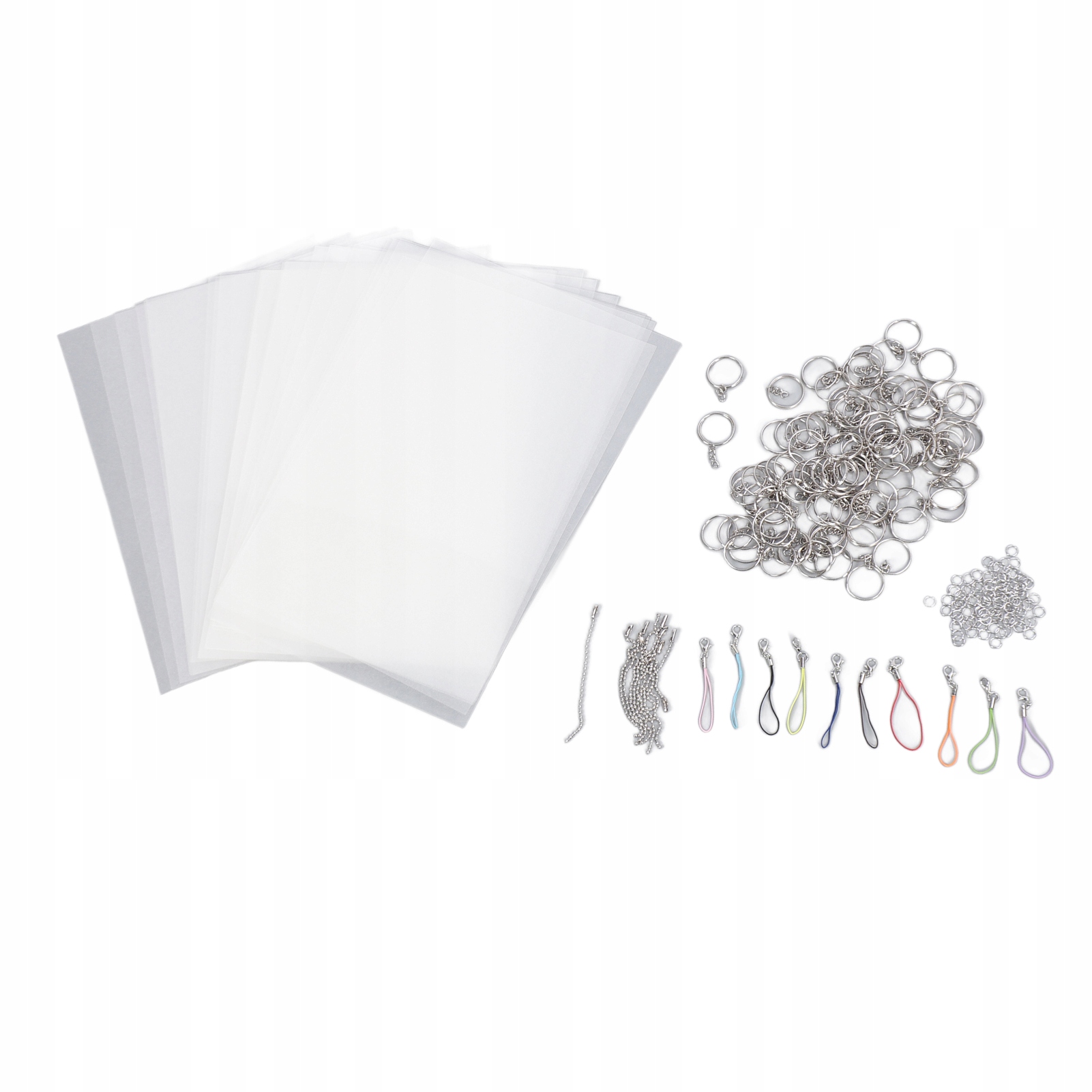1. Повний набір: ви отримаєте 25 аркушів чистої термозбіжної плівки, 100 шт. маленьких брелоків, 100 шт. відкритих кілець, 10 шт. ланцюжків із бісеру та 10 шт. ниток, які ідеально підходять для занять.