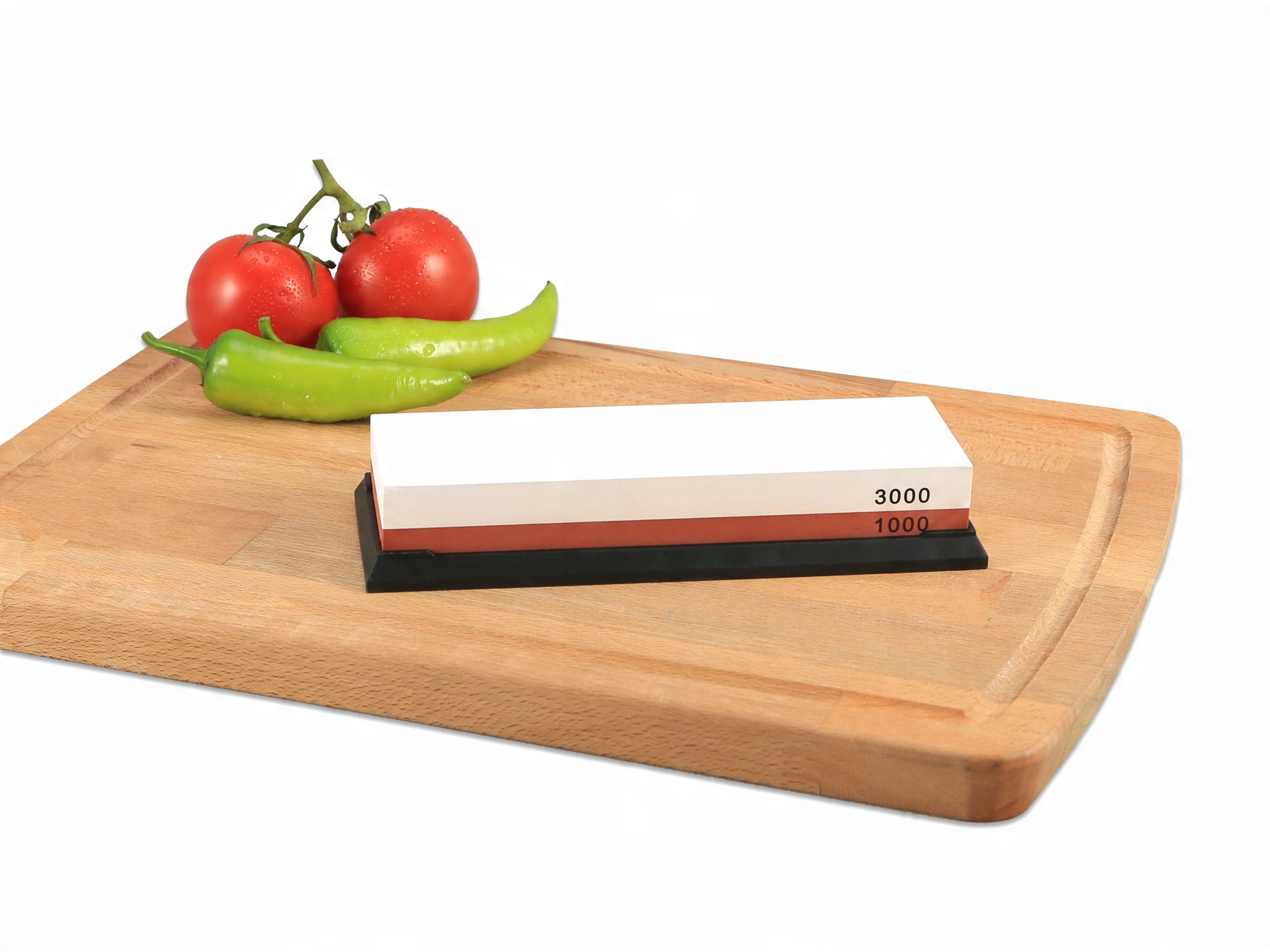 Представляємо вашій увазі фірмовий набір для заточування, що складається з точильного каменю, антиковзаючої основи та направляючої для ножа.