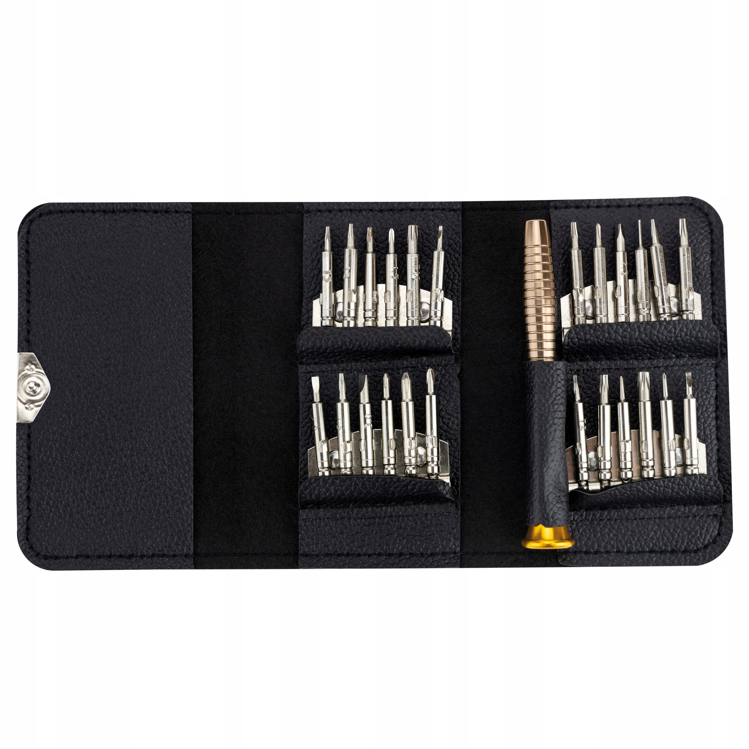 Наш аукціон включає набір прецизійних викруток. Набір містить 24 біти різного розміру, що дозволяє налаштовувати їх під конкретну діяльність і предмет, а також магнітний алюмінієвий тримач. Все це упаковано в елегантний кишеньковий футляр, який закривається затискачем.