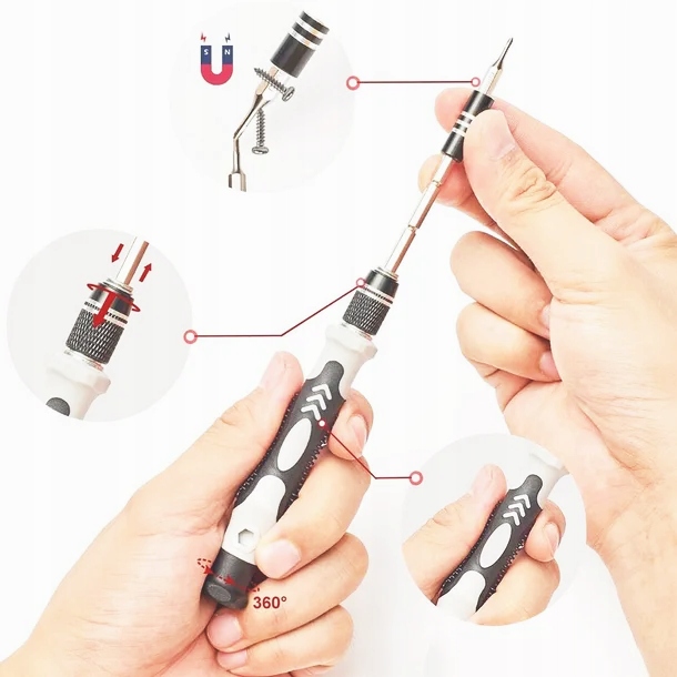- Містить 24 прецизійних насадки, які ідеально підходять для дрібного ремонту електроніки, годинники, окуляри та інші пристрої.