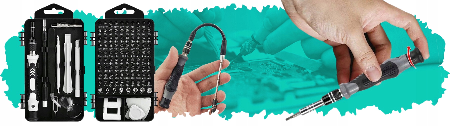 Наш набір містить усе необхідне для ремонту та обслуговування електронного обладнання. Рукоятка спеціальної форми забезпечує легку та стабільну установку та використання точних насадок. Гнучкий подовжувач полегшує доступ до важкодоступних місць. Магнітизатор дозволяє намагнічувати або розмагнічувати наконечники залежно від ваших потреб. У набір також входять 100 різних насадок, які можна легко та швидко встановити у тримач або на один із подовжувачів. Весь набір упакований у невелику двосторонню коробку з прозорою кришкою, що полегшує зберігання та пошук окремих інструментів.