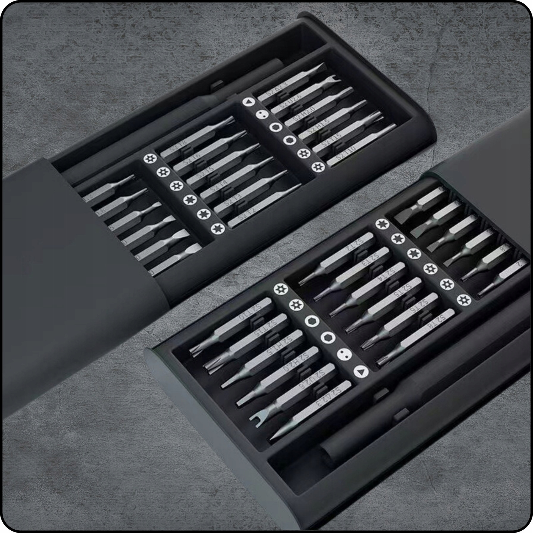 - ✅ 21 x Torx біти (шестикутна зірка): 2x T1, 2x T2, 1x T3, 1x T4, 1x T5, 2x T6, 2x T7, 2x T8, 2x T9, 2x T10, 2x T15, 2x T20 li>