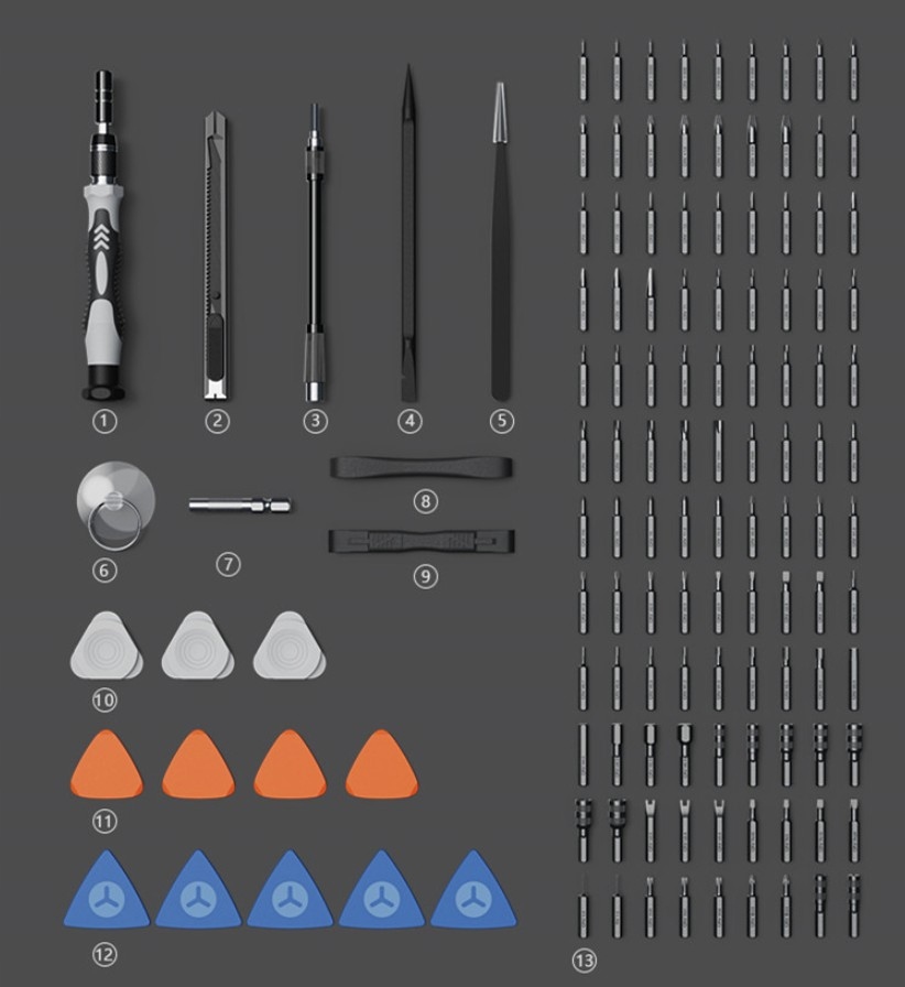 - 120 магнітних біт, зокрема: Torx (T/TB/TH), Pentalobe (P), Phillips (PH), Flat (SL), Triкутний (△), Трикутний (Y), Hexagonal (H), U-подібний (U), квадратний (SQ), круглий (O)