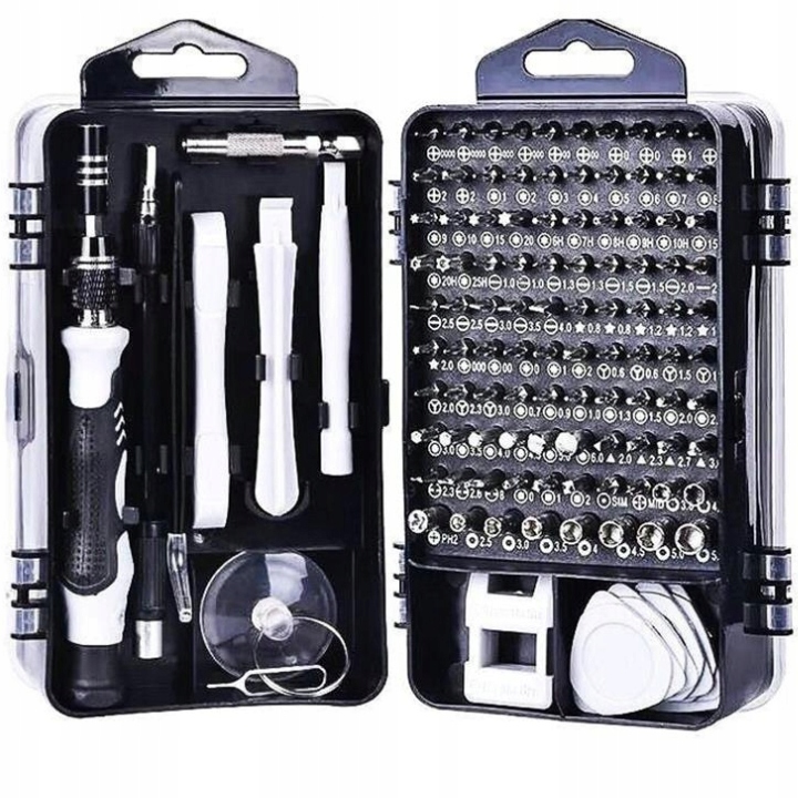 Набір складається зі 115 елементів, які дозволять вам виконувати практично будь-які дії, пов'язані з ремонтом електронних пристроїв, включаючи: телефони, ноутбуки, планшети, побутову техніку та інші точні монтажні роботи, навіть у важкодоступних місцях.