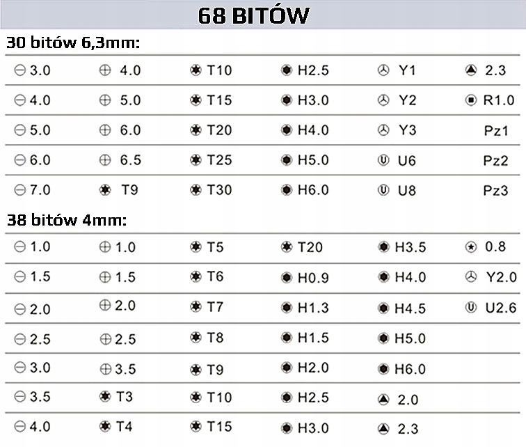 Набір містить 68 біт. 6,3 мм і 4 мм.