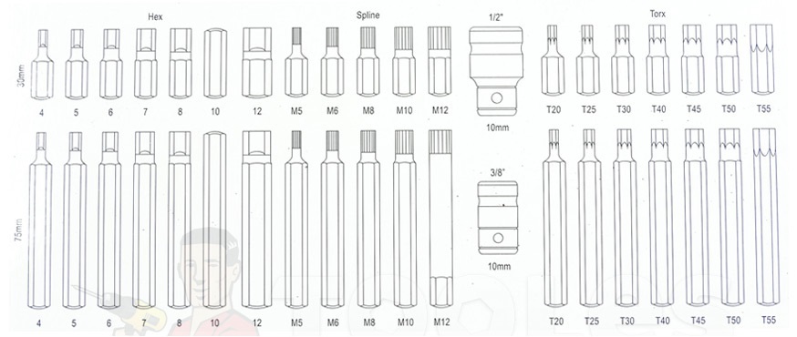 Набір біт для відкручування спеціальних гвинтів, таких як: шестигранник, торкс, шлицеві . Різноманітність насадок дозволяє виконувати багато робіт в спеціалізованих механічних і автосервісах. Наконечники мають дві довжини: 30 і 75 мм, встановлені в шестигранний тримач 10 мм, адаптований для роботи з тріскачкою 1/2" і 3/8".