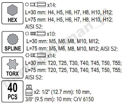 Набір біт для відгвинчування спеціальних гвинтів, таких як шестигранник, торкс, шпонка. Різноманітність насадок дозволяє виконувати багато робіт в спеціалізованих механічних і автосервісах. Наконечники мають дві довжини: 30 і 75 мм, встановлені в шестигранний тримач 10 мм, адаптований для роботи з тріскачкою 1/2" і 3/8".