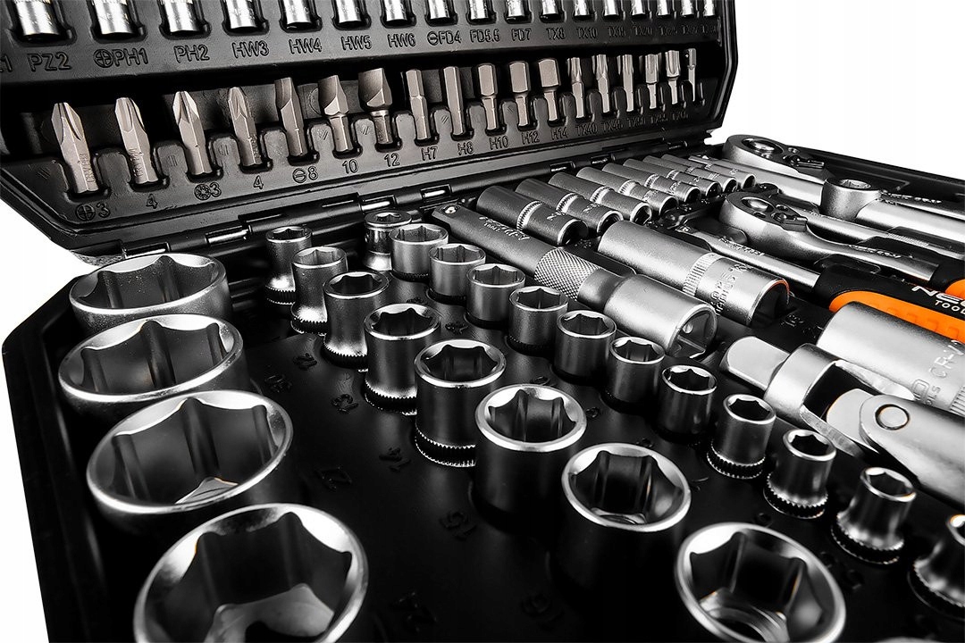 Набір гайкових ключів ½” ¼” 10-211 від NEO TOOLS зі 110 предметів – це комплексний пакет інструментів розмірів ½” та ¼” з матовим покриттям, поміщених у зручний пластиковий футляр із засувками та легким кріпленням. ручка для використання. Складається з 110 елементів з високоякісної хром-ванадієвої сталі. В комплект входять: головки шестигранні 1/2" 17 шт.: 10, 11, 12, 13, 14, 15, 16, 17, 18, 19, 20, 21, 22, 24, 27, 30, 32 мм, головки довгі 1/2" 5 шт.: 14, 15, 17, 19, 22 мм, головки Torx 1/2" 8 шт.: E10, E11, E12, E14, E16, E18, E20, E24, тріскачка 1/ 2" , 72 зуба, 1/2" T-образна ручка, подовжувачі 1/2", 2 шт.: 125 мм і 250 мм, головки для свічок 1/2", перехідник 5, 16", шарнір 1/2". , головки шестигранні 1/4" 13 шт.: 4, 4.5, 5, 5.5, 6, 7, 8, 9, 10, 11, 12, 13, 14 мм, головки шестигранні 1/4" 8 шт.: 6, 7, 8 , 9, 10, 11, 12, 13 мм, головки Torx 1/4" 5 шт.: E4, E5, E6, E7, E8, тріскачка 1/4", 72 зуба, тримач біт 1/4" , ручка типу T 1/4", подовжувачі 1/4" 2 шт.: 50 мм і 100 мм, шарнір 1/4", розетки 1/4" 18 шт.: T8, T10, T15, T20, T25, T27 , T30 , H3, H4, H5, H6 мм, PH1, PH2, PZ1, PZ2, SL4, SL5, SL7, насадки 5, 16" 17 шт.: TX40, TX45, TX50, TX55, TX60, HEX7, HEX8, HEX10 , HEX12 , HEX14, PH3, PH4, PZ3, PZ4, SL8, SL10, SL12, 4 шт. Шестигранні ключі: 1,3, 1,5, 2, 2,5 мм. Якість і надійність продукції підтверджується гарантією 25 років і Сертифікат TÜV Rheinland M+T. Торгова марка NEO TOOLS відповідає очікуванням професіоналів.