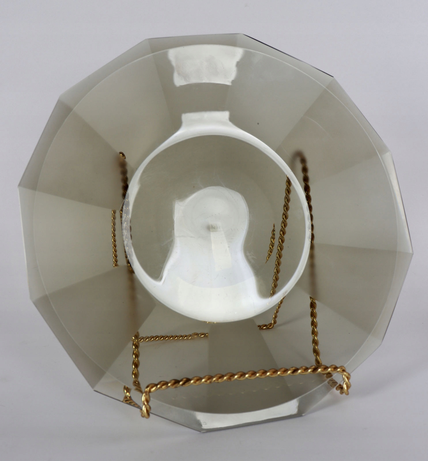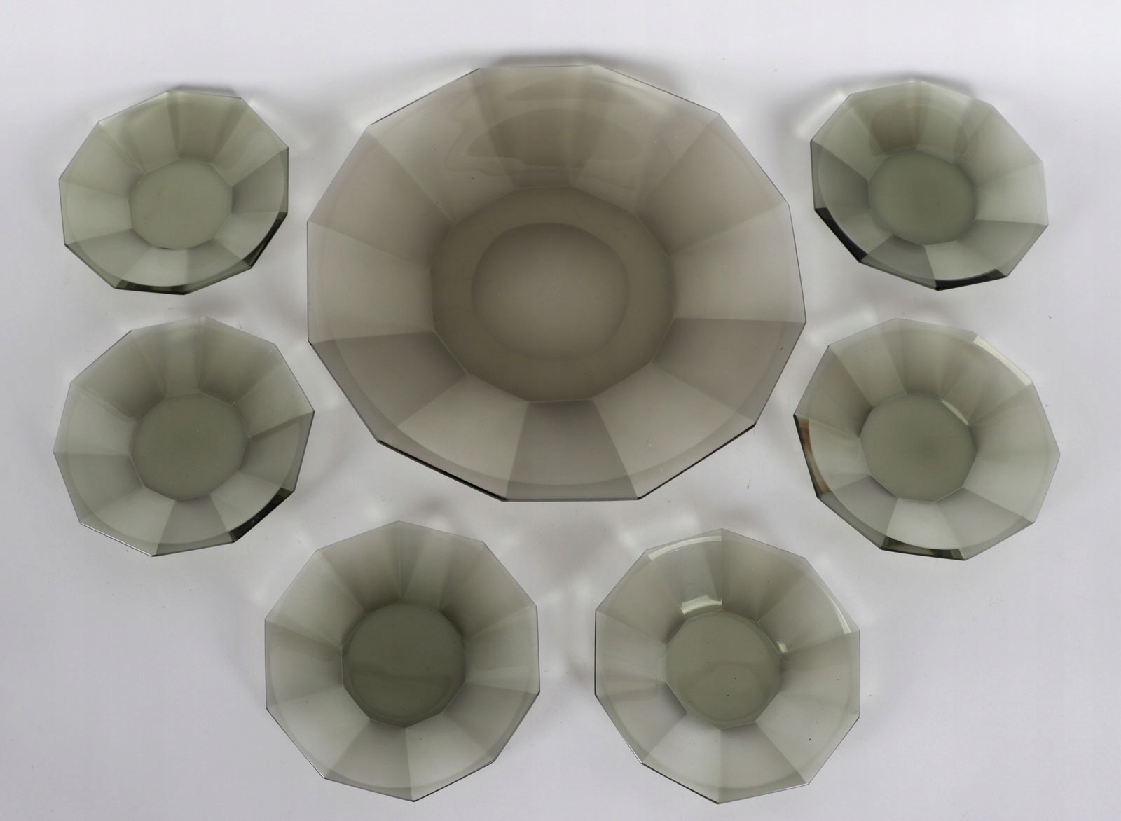 набір торта , що складається з великої тарілки та 6 пластин. Набір виготовлений з свинцевого скла, забарвленого в димовій масі. Рукописне і матове скло.