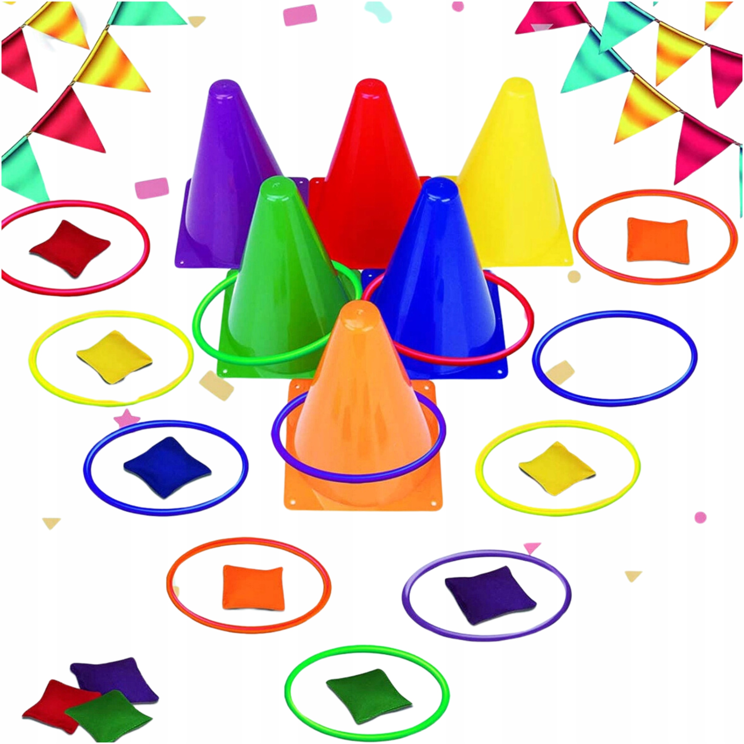 ☑️ 6 конусів ☑️ 12 бобів ☑️ 10 обручів ☑️ Портативна сумка ☑️ Гра для дітей 3+