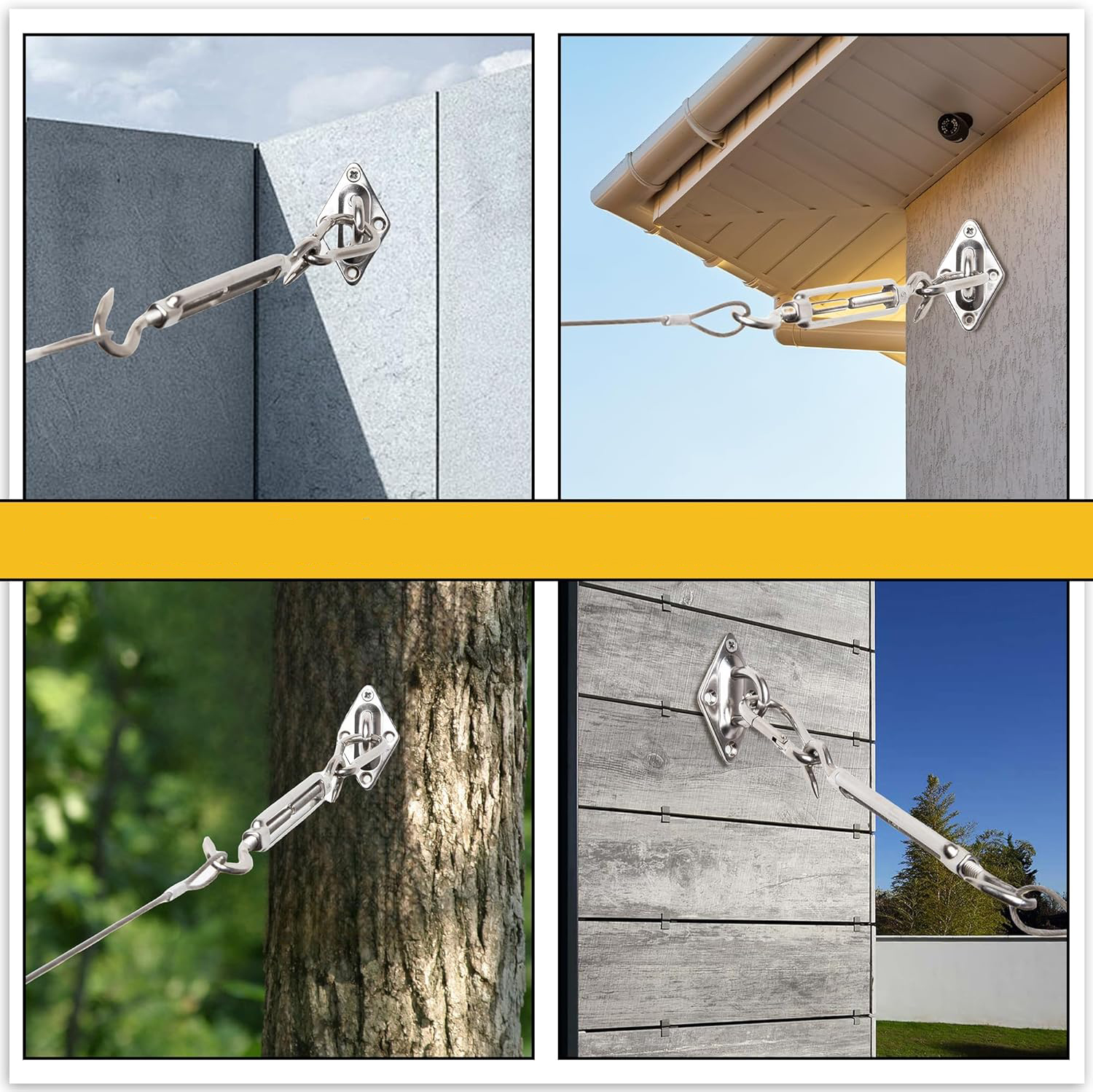 Цей комплект кріплення сонцезахисної штори використовується не лише для встановлення вітрила штори, але також часто використовується як провідний кабель для собаки, дріт для підвішування картин, кабель для літака, мотузка для білизни, набір для підвішування світильників, перила для палуби своїми руками тощо. Це чудовий вибір для підвішування внутрішніх/зовнішніх штор, вітряних курантів, різдвяних прикрас/прикрас на Хелловін.