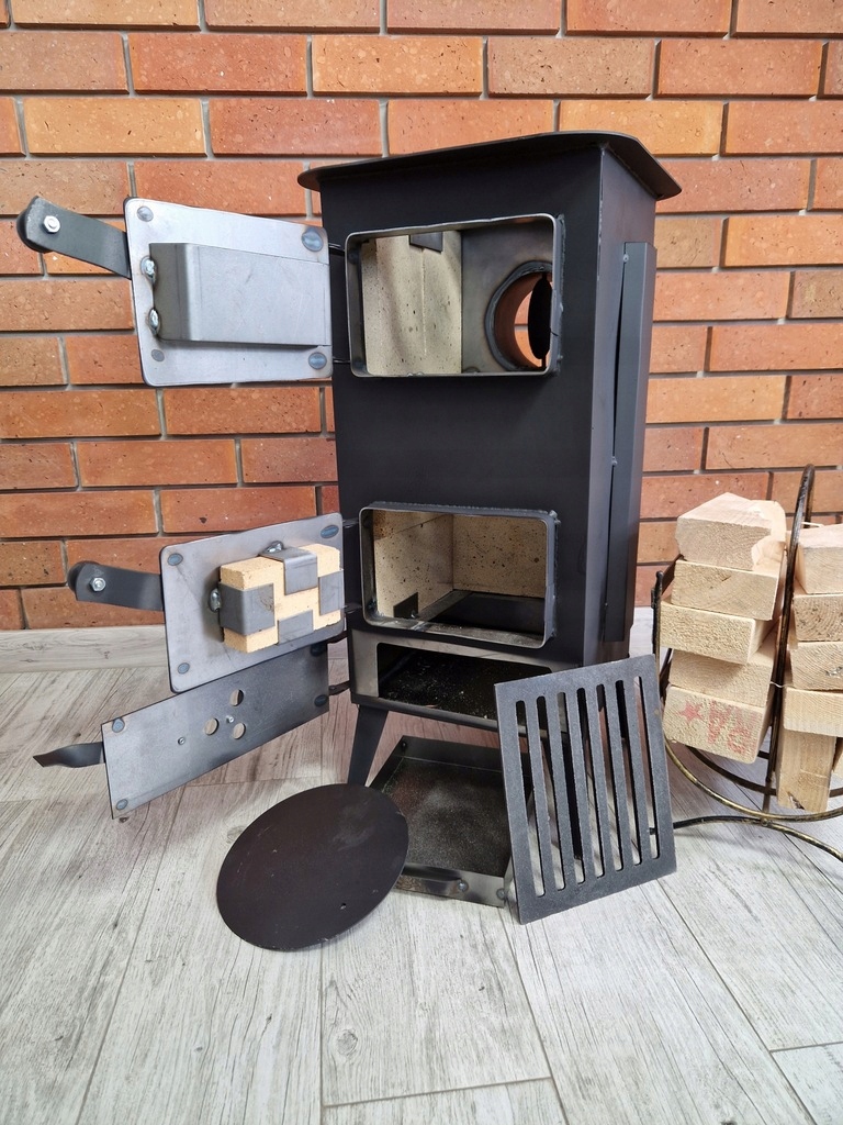 - Повністю заповнений 12 шматками шамоту, що виключає прямий контакт вогню з листовим металом і продовжує довговічність приладу.