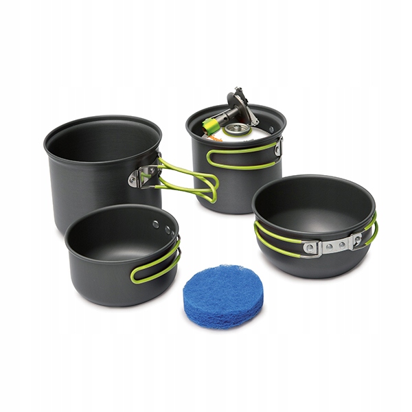 Набір посуду з чотирьох предметів для двох туристів, для приготування їжі просто неба.