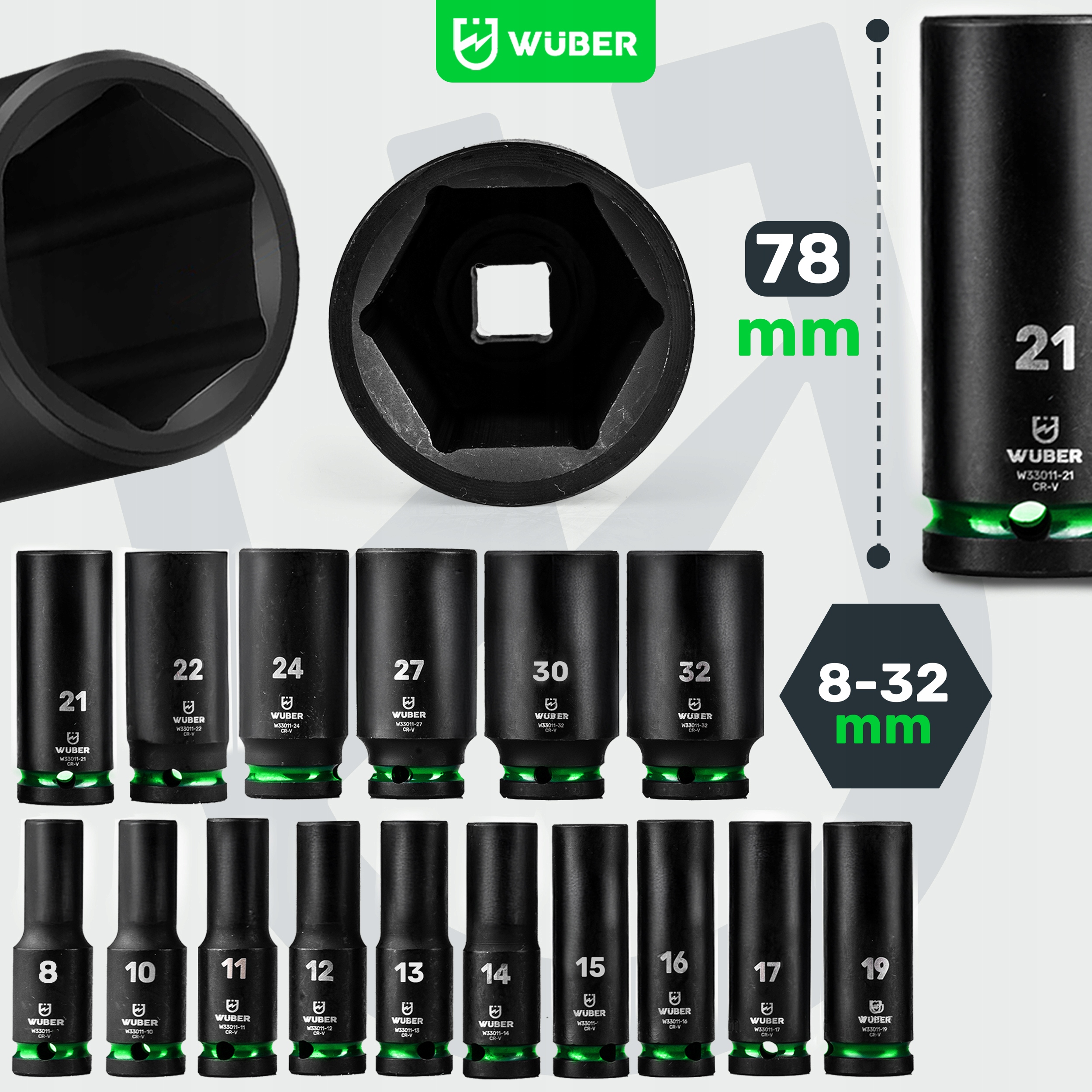Набір ударних ковпачків 16 шт. 1/2 "6-тулуг довгі ковпачки 8-32 мм Wuber