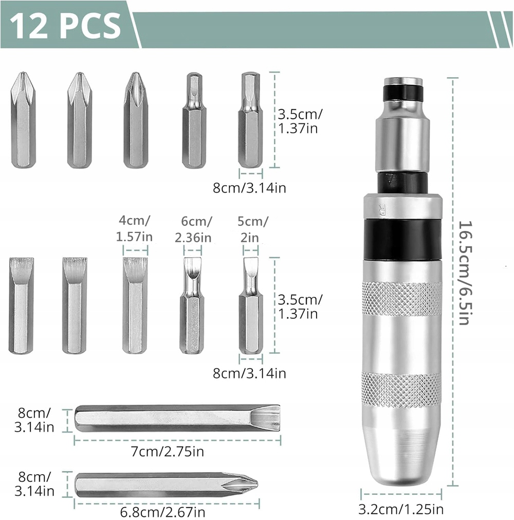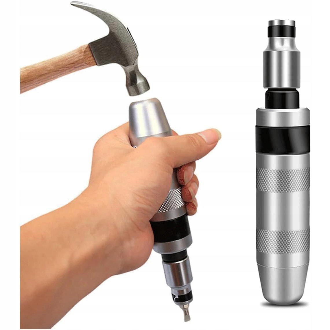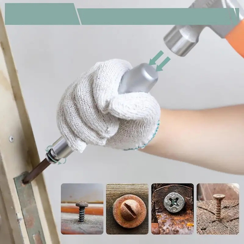 Вирівняйте свердло з гвинтом і вдарте молотком прямо по задній частині перфоратора. Переднє свердло обертатиметься автоматично, а головку можна регулювати для обертання вперед або назад. Підходить як для затягування, так і для відкручування гвинтів.