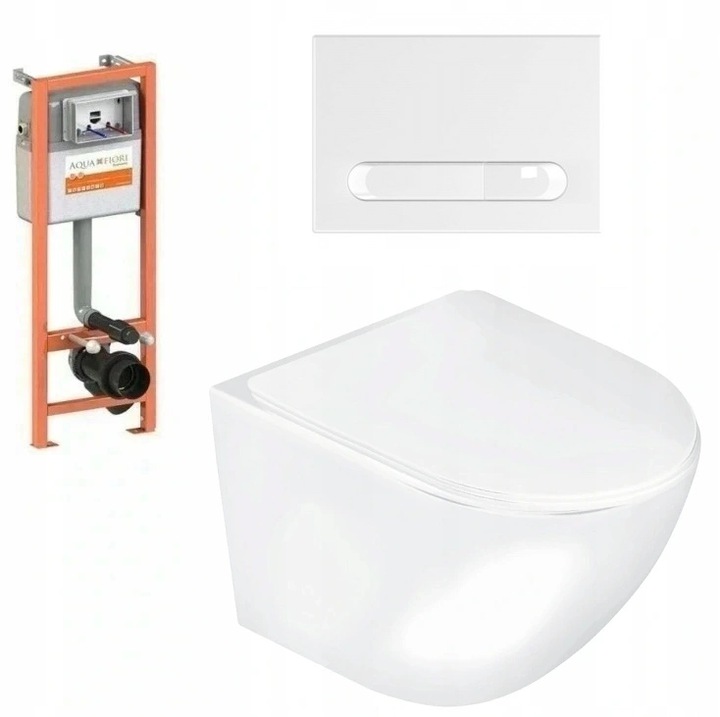 НАБІР БІЛОГО УНІТАЗУ БЕЗ ОБОРДКА, РАМКА ВПЛІВНОГО ВСТАНОВЛЕННЯ, СКЛОНА КНОПКА