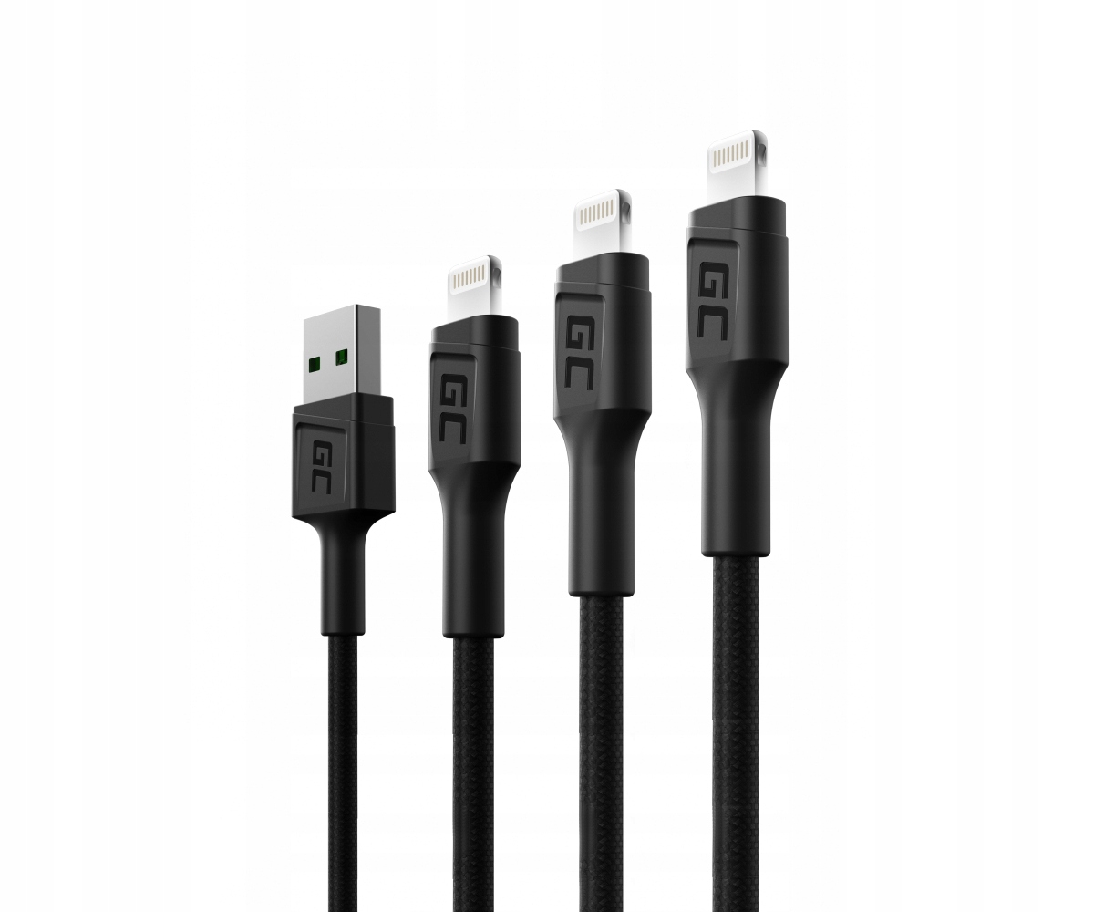 Набір з трьох кабелів Green Cell USB - Apple Ligtning довжиною від 30 см до 2 м. Кабелі виготовлені з високоякісних матеріалів. забезпечує чудову передачу та довговічність. Крім того, кабелі мають стильне біле підсвічування, яке створює дивовижний ефект після настання темряви. Заряджайте свої пристрої зі швидкістю світла та використовуйте їх на таких пристроях, як iPhone та iPad.