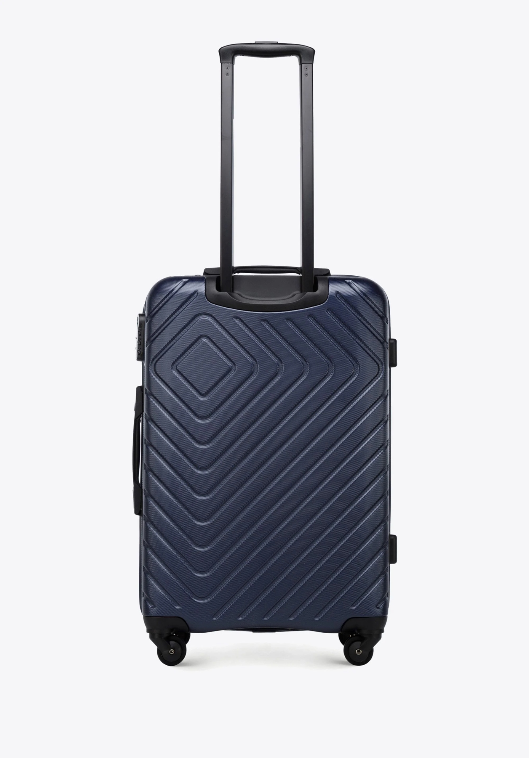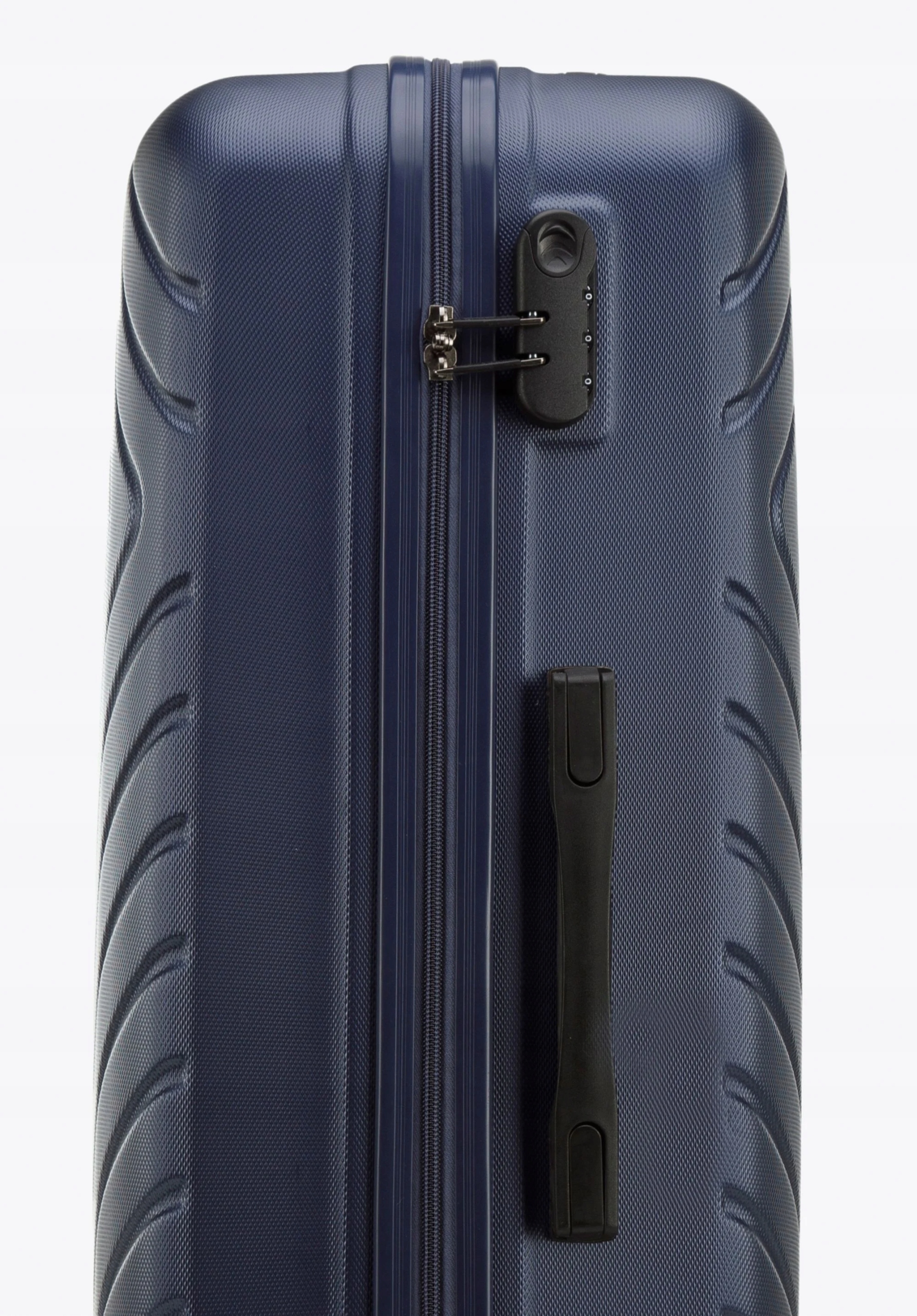 Набір елегантних валіз з АБС ідеально підійде для численних подорожей. Валізи легкі і місткі, а матеріал, з якого вони виготовлені, відрізняється високою стійкістю до пошкоджень і подряпин. Мала валіза відповідає вимогам до ручної поклажі таких авіакомпаній: EasyJet, LOT, Lufthansa, Ryanair, Wizz Air, Aeroflot. Кожна валіза оснащена чотирма поворотними колесами для для полегшення переміщення, висувна телескопічна ручка, 2 гумові ручки (у кабінної валізи тільки верхня ручка). Всередині валізи мають основне відділення з еластичними ременями для захисту багажу від переміщення, відділення, що закривається на блискавку, і 2 кишені, одна з сітки, а інша меншого розміру, обидві закриваються на блискавку. Доступ сторонніх осіб всередину запобігає оснащенню валіз кодовим замком, що є додатковою перевагою багажу. Ефектне геометричне тиснення на корпусі додає валізи стилю.