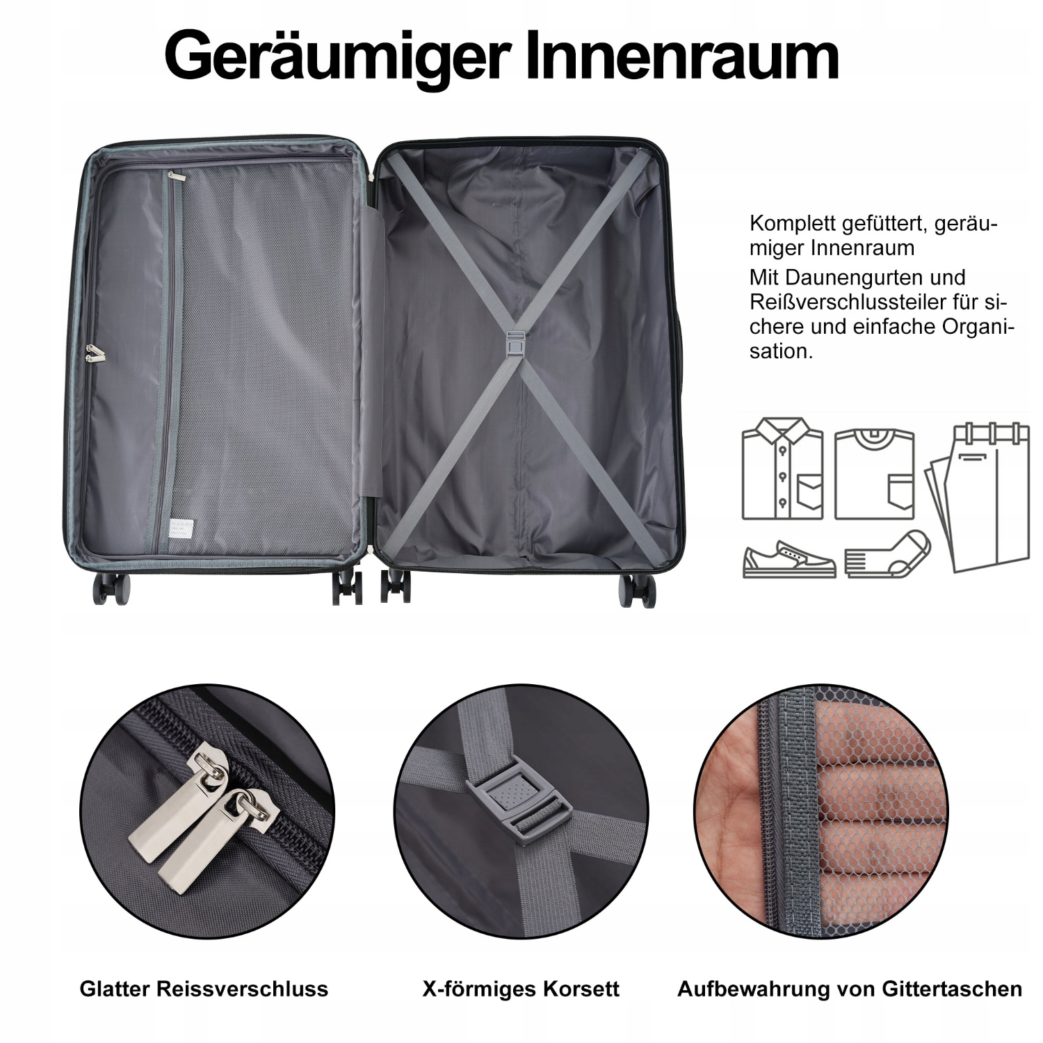 Замок TSA: багажні візки з замками TSA ідеально підходять для міжнародних подорожей, оскільки вони захищають цінні предмети та дозволяють персоналу аеропорту перевіряти багаж, не відкриваючи замок. Просторий інтер'єр: валіза пропонує багато місця для одягу, взуття, косметики та інших необхідних подорожей. Він також має сітчасті кишені та поперечні смуги, які полегшують організацію та зберігання.