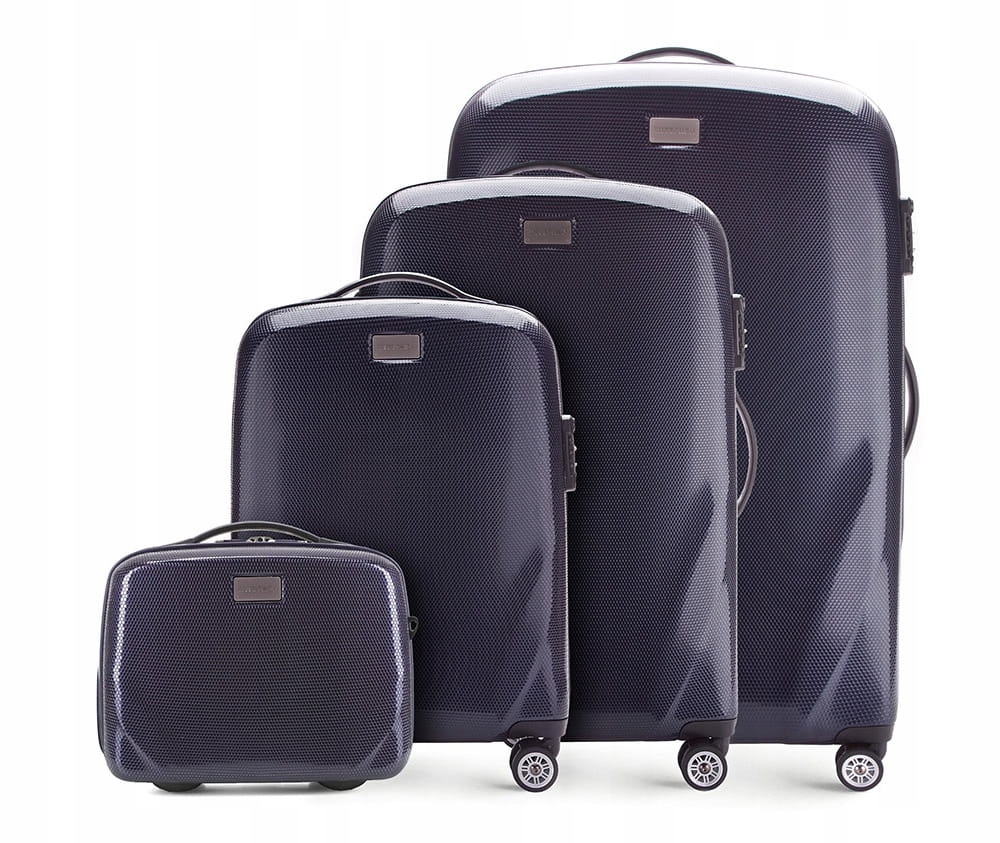 Практичний, міцний, місткий, сучасний комплект валіз WITTCHEN 56-3P-57K-90 з полікарбонату, з косметичкою, легкий, на чотирьох колесах, з кодовим замком TSA, для відпочинку, для дальшої подорожі, функціональний, стійкий до подряпин, стильний, елегантний, зручний, темно-синій.