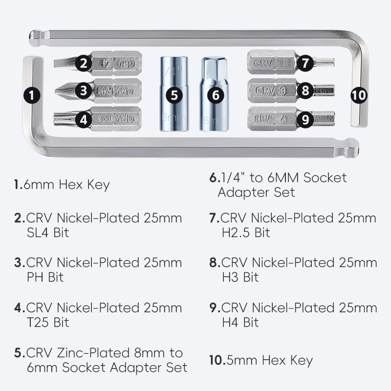- 10 робочих порад - набір містить 10 типів біт, які добре працюватимуть з різними гвинтами та технічними застосуваннями.