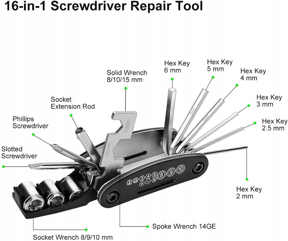 Велосипедний мультиінструмент містить такі інструменти, як шестигранні ключі різних розмірів, ріжковий ключ, торцеві ключі та викрутки.