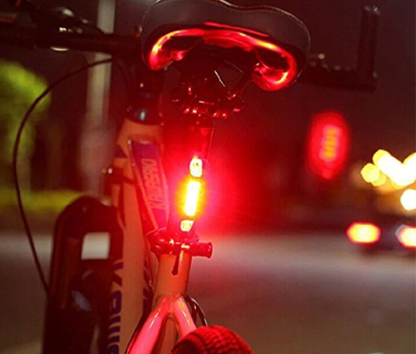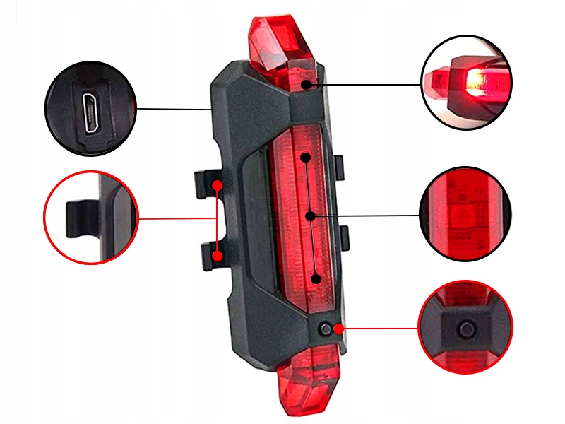 Червоний USB-задній велосипедний ліхтар для кріплення на підсідельному штирі за допомогоюдвох гумок.