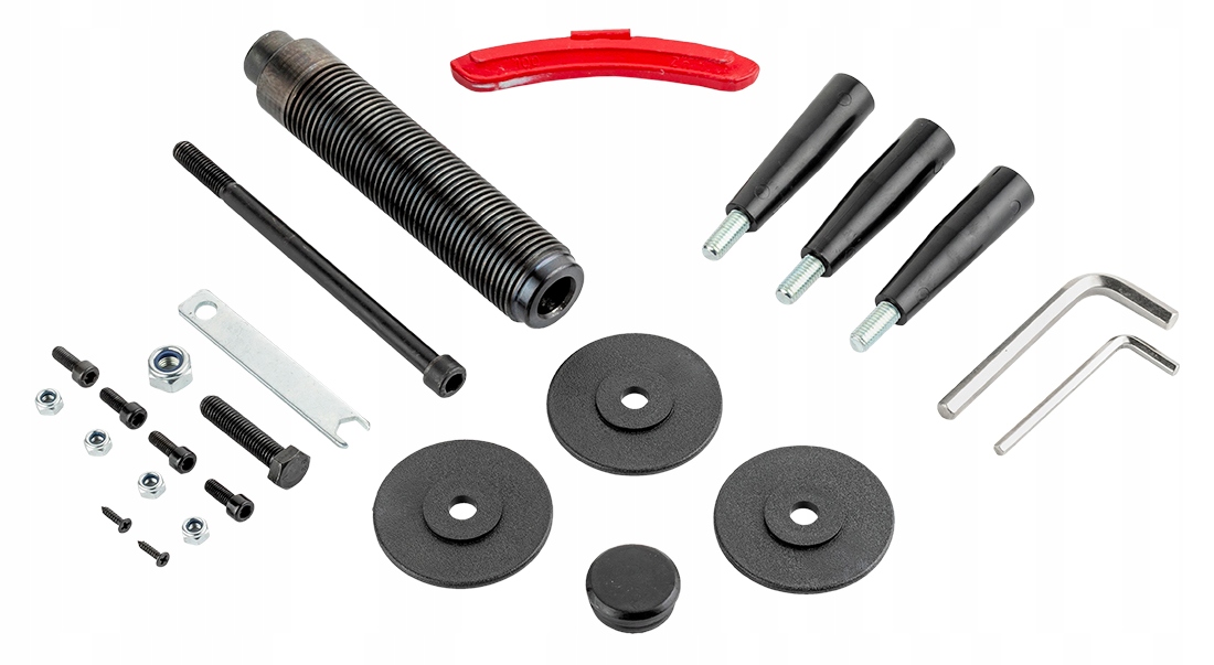 - Стандартне обладнання: 4x Конус (43-66,65-85,84-102,94-135), 1x Плоскогубці, 1x Калібрувальний грузик 100 г, 1x Швидкозжимна гайка, 1x Мала втулка, 1x Велика втулка + гума, 1x вимірювальний компас, 1x різьбовий стрижень 36*3, 1x посібник користувача, 3x вішалка з шайбами