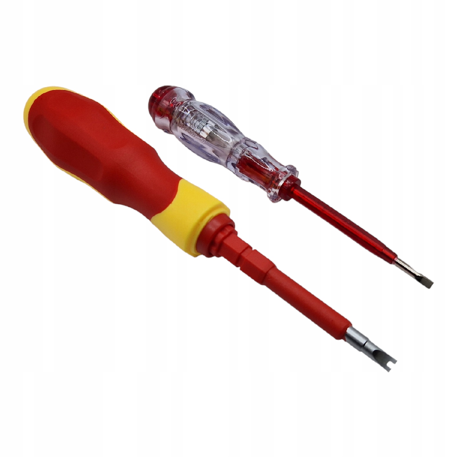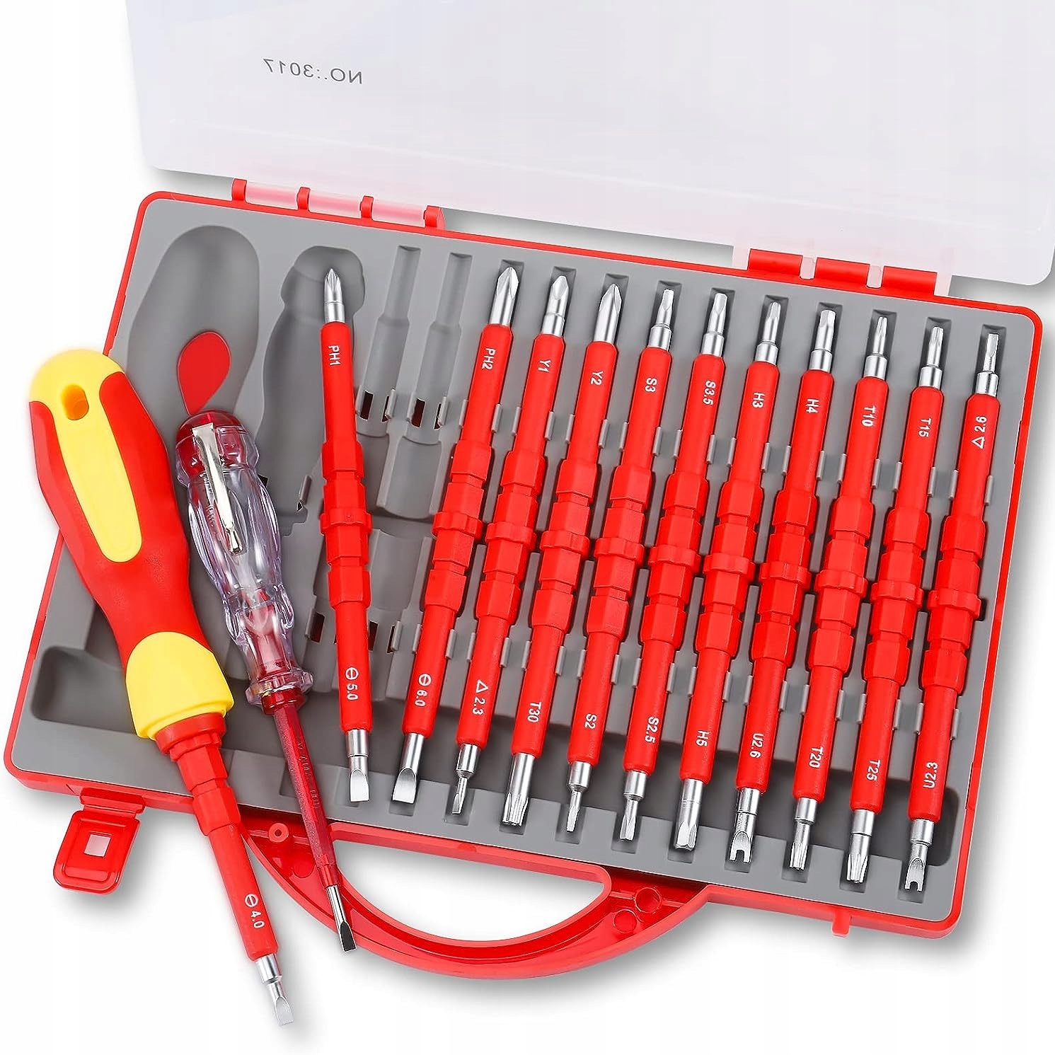 Набір із 12 викруток із подвійною ізоляцією на 1000 В зі змінною ручкою. Крім того, набір включає тестер напруги, призначений для визначення напруги в розетках.