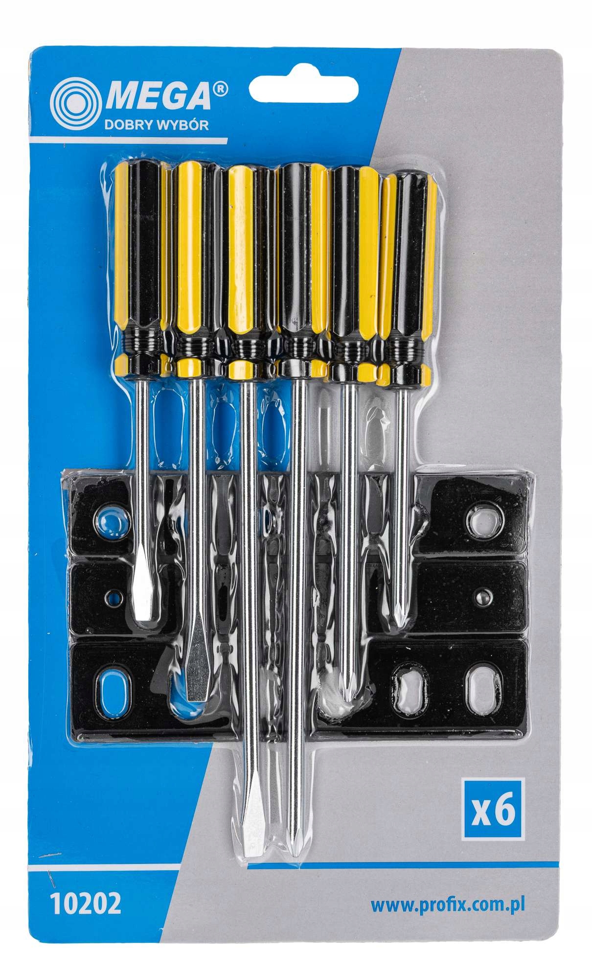 Набір викруток MEGA 10202 складається з 6 предметів із настінною полицею. Включає плоскі викрутки (3,5x75, 4x100, 5x150) і викрутки PH Phillips (1x75, 1x100, 2x150). Ідеально підходить для домашнього ремонту, складання меблів і організації інструментів, він прискорює роботу та забезпечує довговічність у випадковому використанні.
