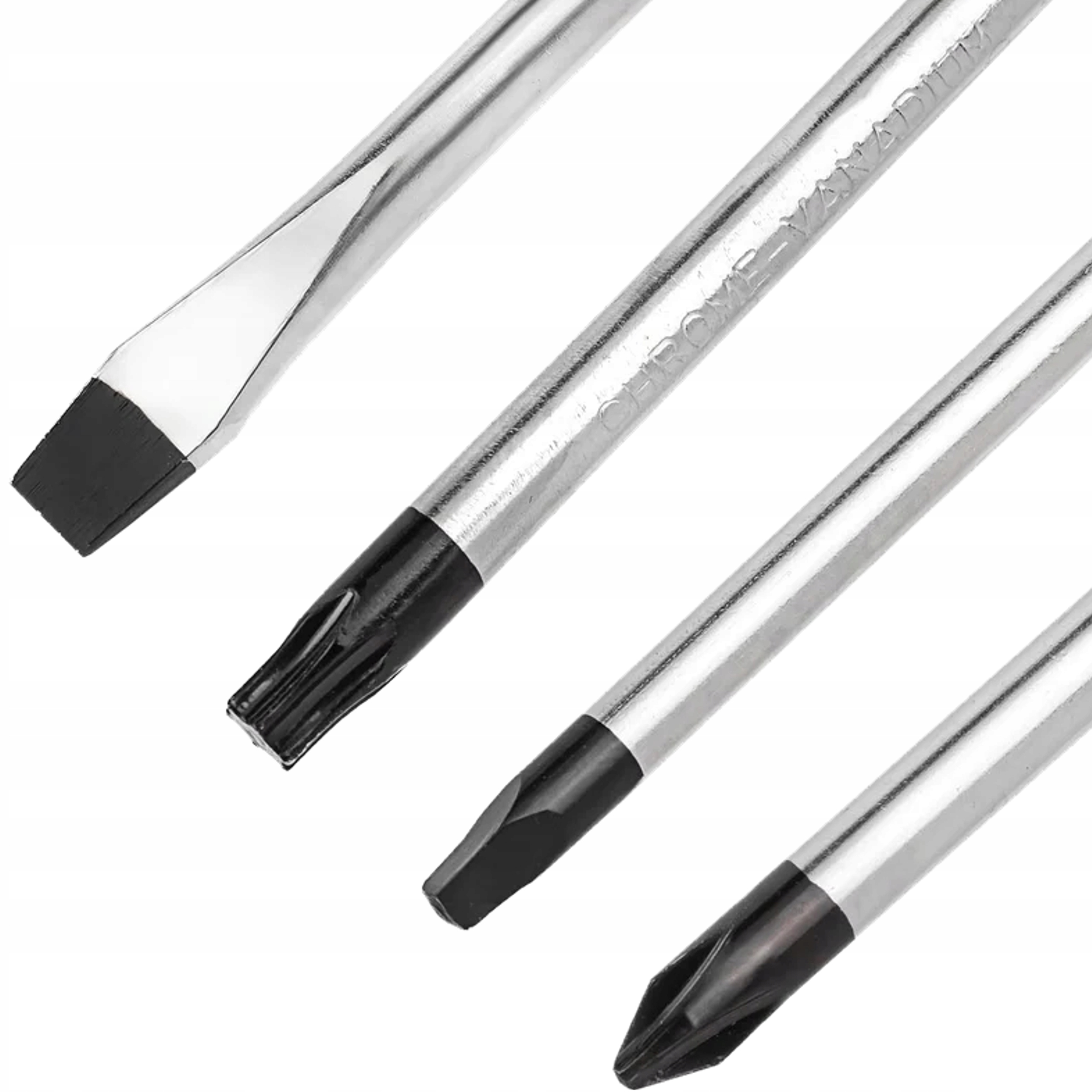 Стержни та насадки для викруток виготовлені із загартованої хромованадієвої сталі (Cr-V), яка є стійкою до зношування та деформації. Цей матеріал гарантує довговічність інструментів навіть після інтенсивного використання.