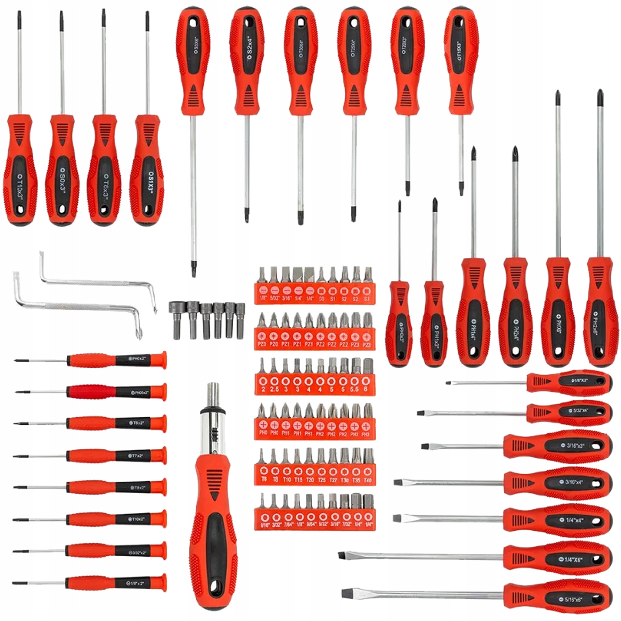 Набір містить плоскі викрутки, викрутки Phillips, Torx, квадратні викрутки та широкий вибір біт і головок. Завдяки цьому набір охоплює практично всі найпоширеніші види шурупів і шурупів.
