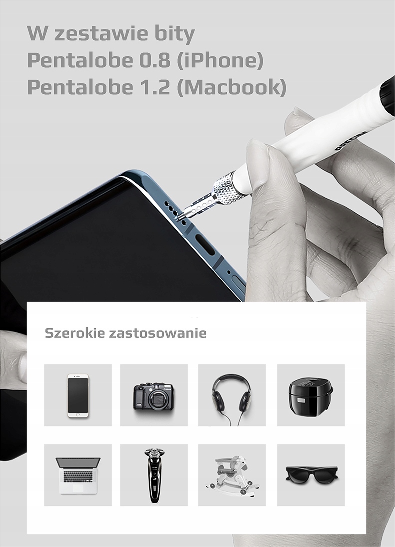 - 2 гнізда Pentalobe (з п’ятьма спицями) – P2 0,8 мм, P5 1,2 мм (моделі iPhone, MacBook Air/Pro)