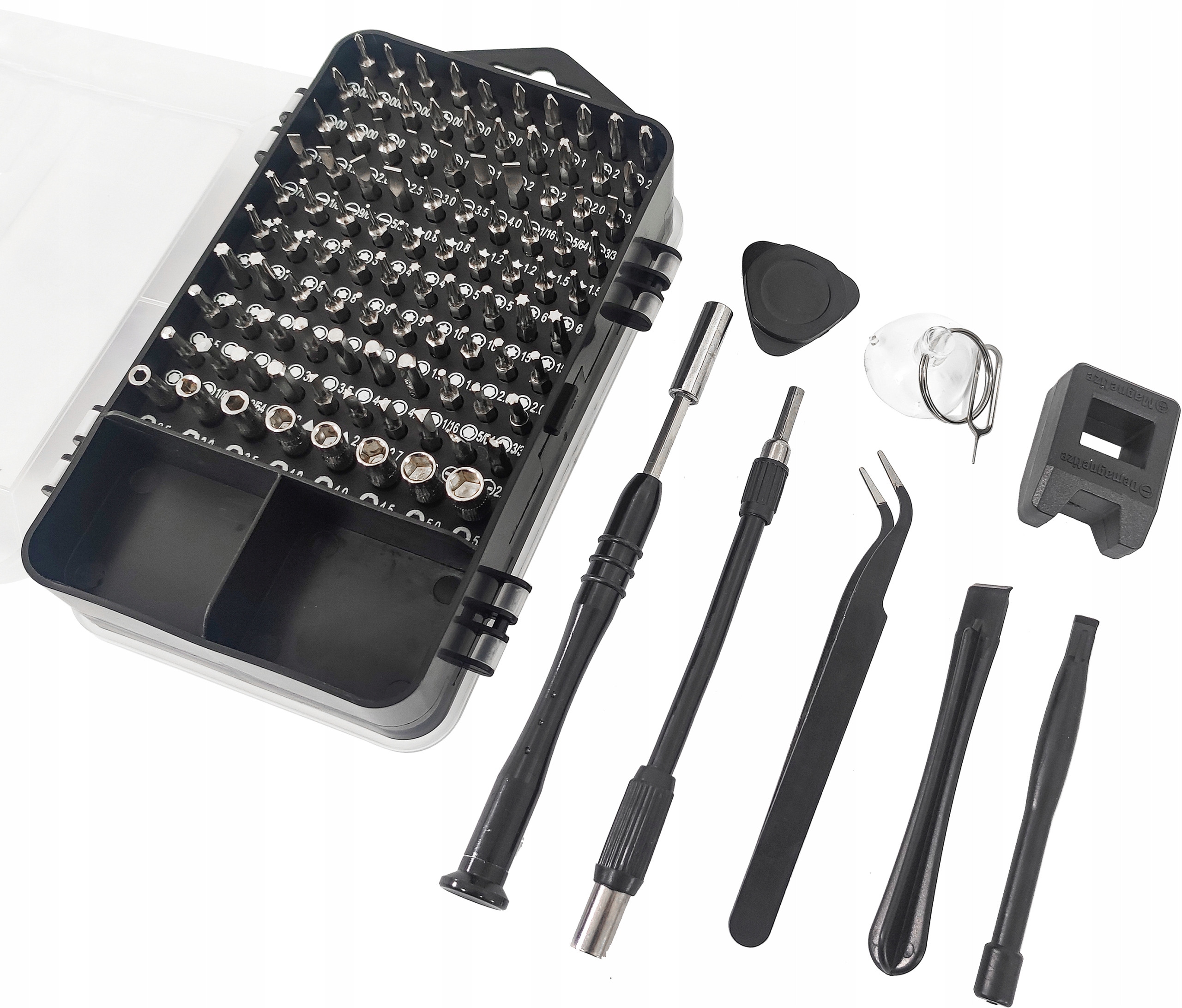 Набір укомплектований аж 110 елементами, що дозволить виконувати професійний ремонт. У набір входять необхідні інструменти і велика кількість викруток, які допоможуть вам при саморобці. Аксесуар також включає в себе відкривачки футлярів, магнітізатор/розмагнічувач для розеток і багато інших аксесуарів.