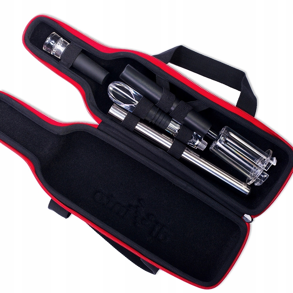 Знявши гаджети, ви можете помістити в нього пляшку вина та захистити це під час транспортування. Футляр Extreme Wine Bottle Case відмінно захистить його від злому, а міцна ручка дозволяє зручно переносити футляр з вмістом. Дуже практично. Кожен елемент набору включений через свою корисність. Натискний штопор дозволяє швидко та без зусиль відкрити пляшку під тиском. Охолоджувальна бурулька зберігає низьку температуру напою і полегшує розливання вина по келихах. Пробка з насосом захищає напій від розливання і дозволяє довше зберігати вино свіжим, видаляючи повітря з пляшки.