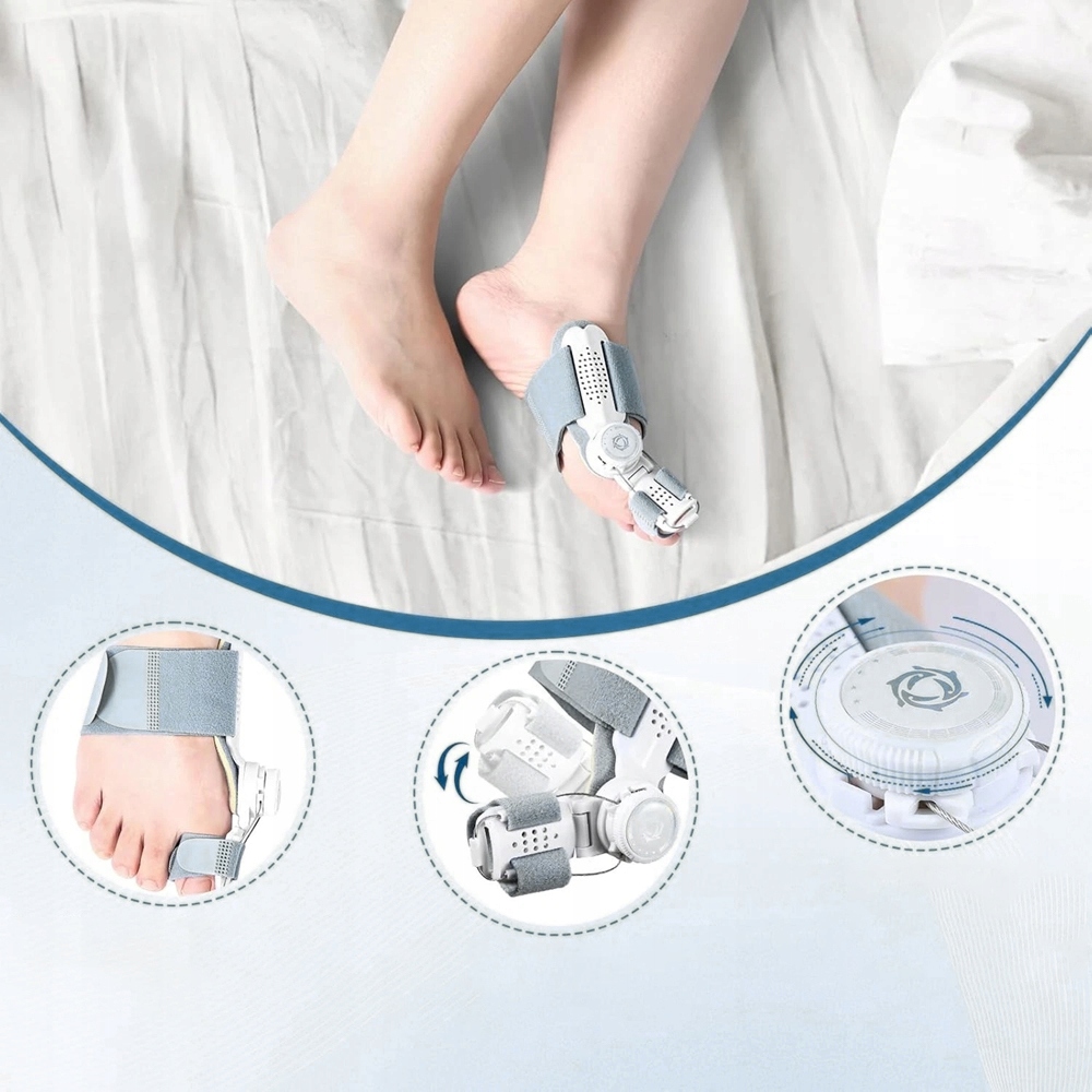 🦶【Ефективна корекція вночі】Регульована ручка та шарнір, що обертається на 180°, використовуються для точного налаштування кута корекції для поступового виправлення неправильного положення. Завдяки розтягуванню вкорочених сухожиль і зв’язок палець ноги повертається у своє природне положення під час сну чи відпочинку. Однак при тяжкому вальгусному синдромі поступове пристосування має ключове значення, щоб уникнути раптової корекції.