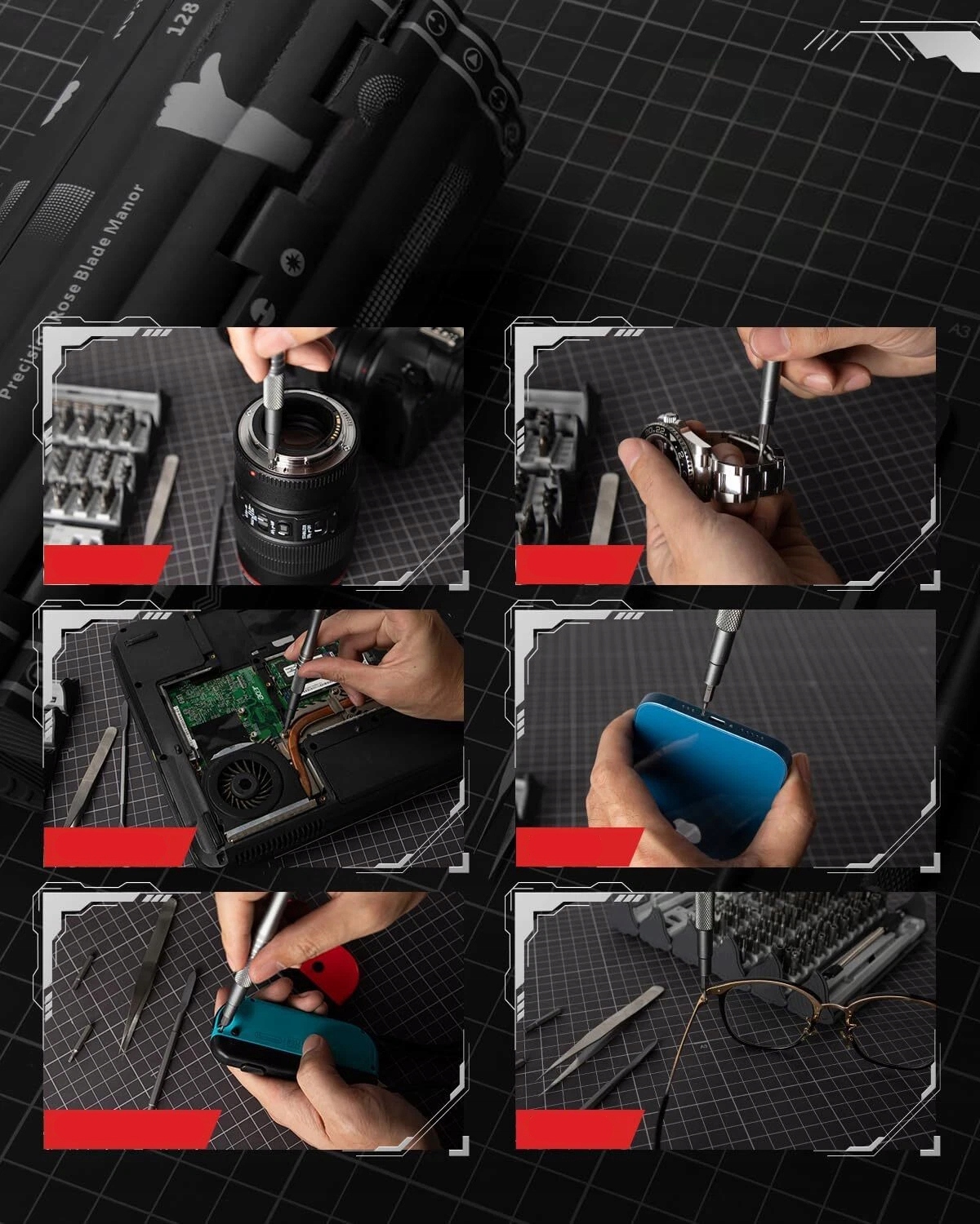 【Універсальний】Набір точних інструментів 128-в-1 включає 122 високоякісні насадки та 6 основних інструментів, включаючи ручку викрутки, подовжувач, намагнітник, розмагнітувач, точні пінцети та двосторонній важіль. Для ноутбука, смартфона, камери чи окулярів цей набір ідеально підходить для професіоналів і любителів DIY.