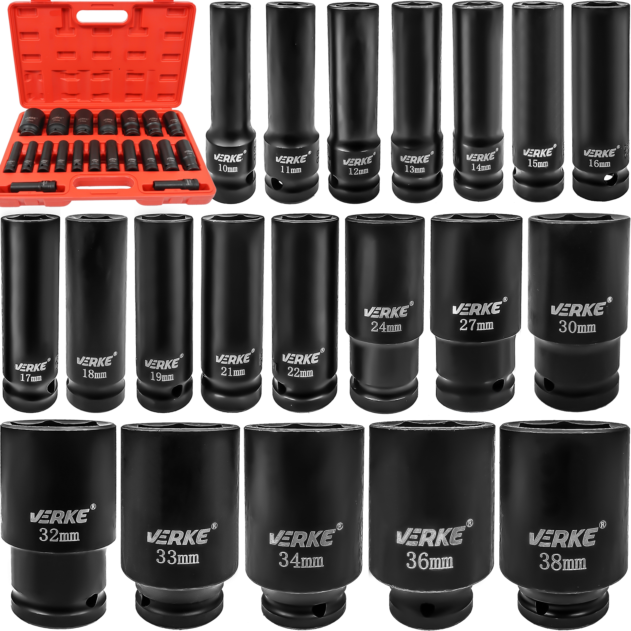 - Довгі шапки удару 1/2 ": 10, 11, 12, 13, 14, 15, 16, 17, 18, 19, 21, 22, 24, 27, 30, 32, 33, 34, 36, 38 мм