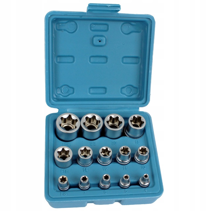 Набір головок E-TORX для 1/2", 3/8" і 1/4". Набір ретельно і точно виготовлено з високоміцної хром-ванадієвої сталі (CrV), що значно збільшує їх міцність і термін служби. Набір стане в нагоді в кожній професійній автомобільній майстерні та в домашньому гаражі. Все упаковано в зручну і міцну пластикову валізу.