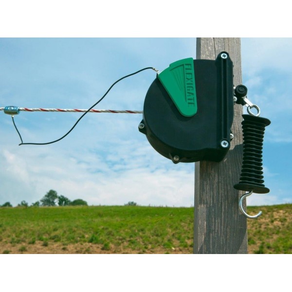 Набір Flexigate дозволяє підключити вхід до загону до електричного кола, що міститься в огорожі. Під час відкриття стрічка або шнур автоматично замотуються всередину касети.