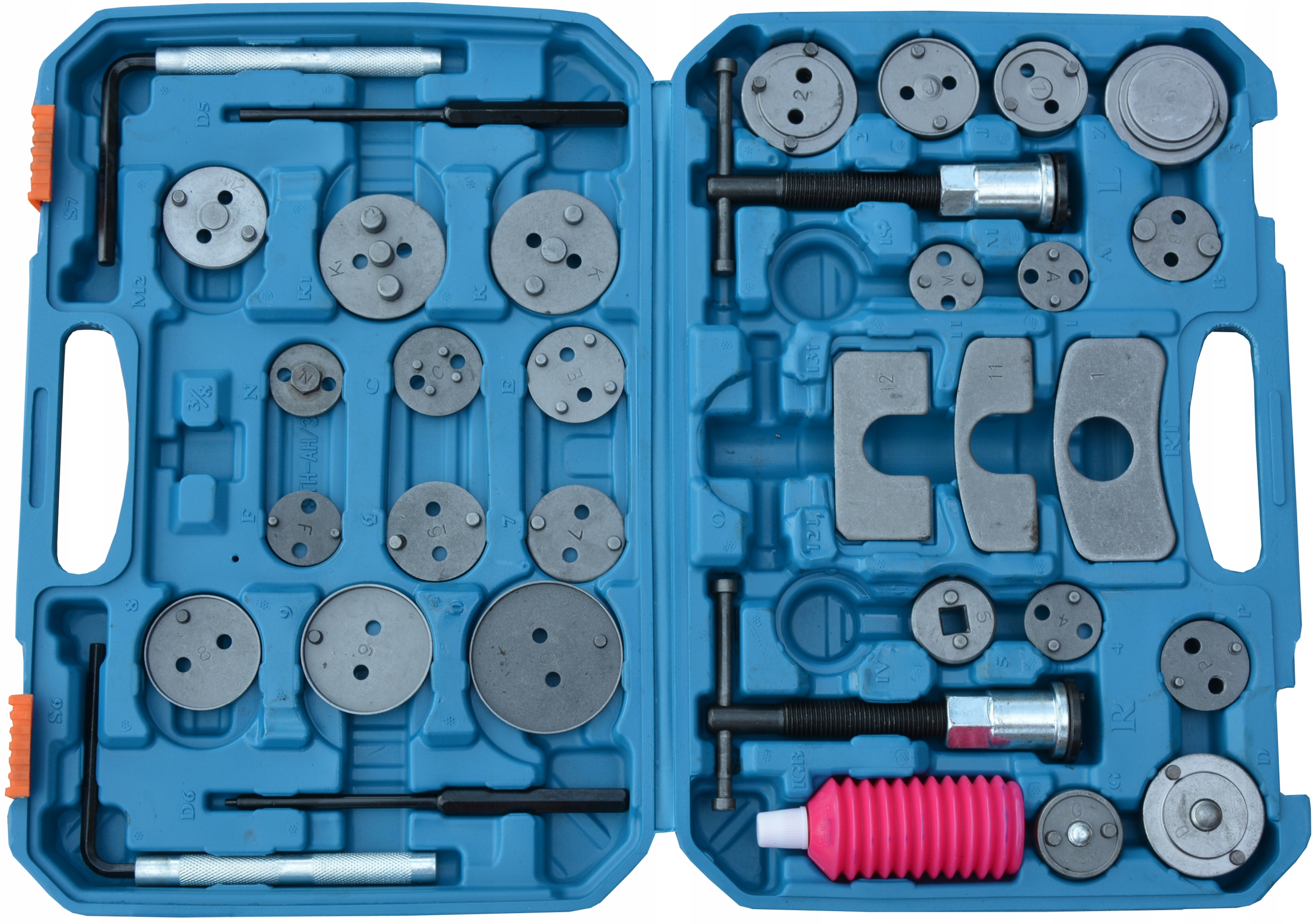 Професійний набір для повернення/стискання поршнів у циліндрах гальмівної системи, необхідних для ремонту транспортних засобів, оснащених гальмами дисків. Ручки оснащені магнітними кінчиками, завдяки якій вони підтримують тарілку, яка відповідає заданому поршню на осі. Він призначений для кожної майстерні автомобіля, де він допомагає прискорити послугу гальмівних систем. Набір підходить до більшості автомобілів на ринку. Всі упаковані в пластикову валізу.