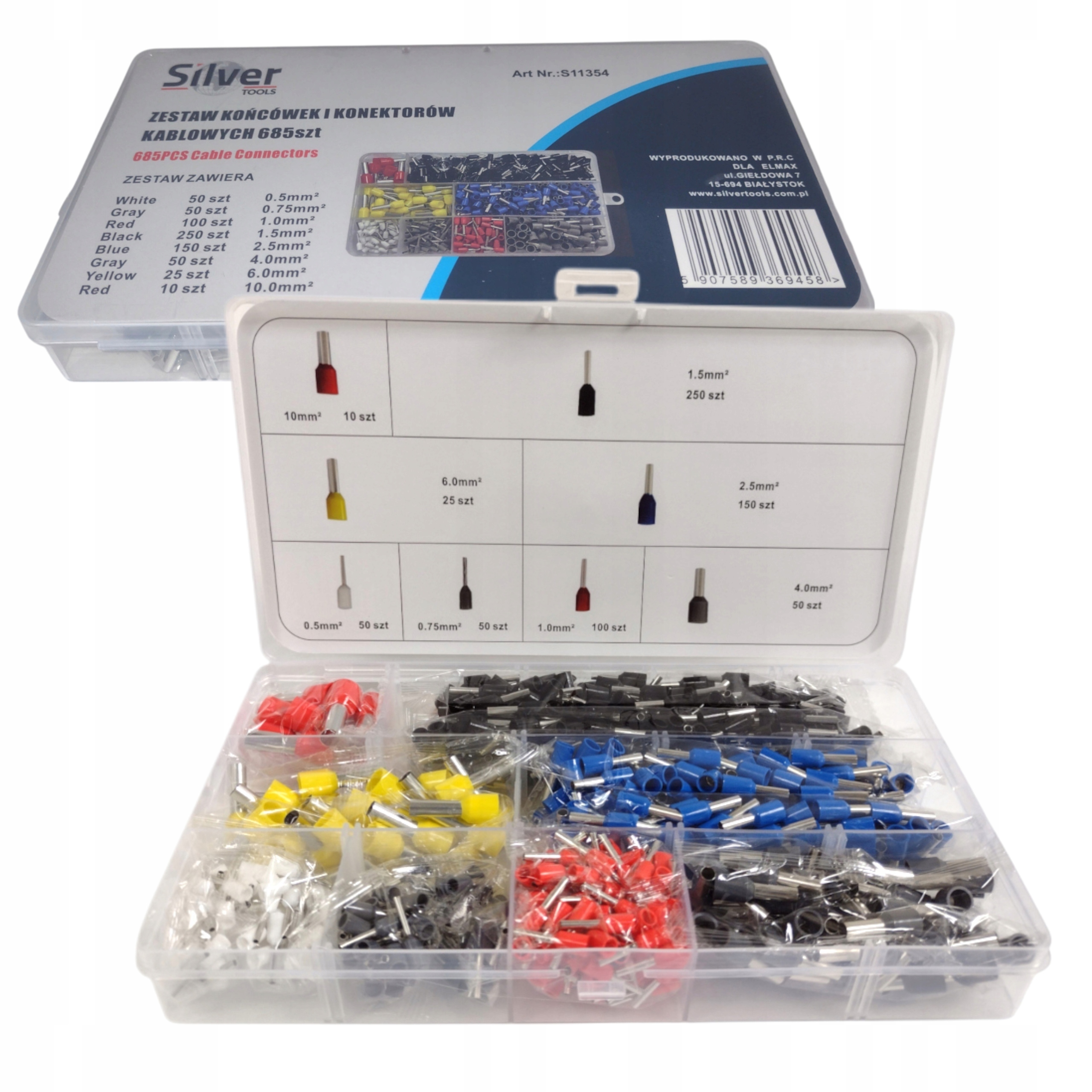 СРІБЛИВИЙ НАБІР КАБЕЛЬНИХ ГІЛЬЗІВ КОНЕКТОРІВ 685 шт. ОРГАНІЗАТОР S11354