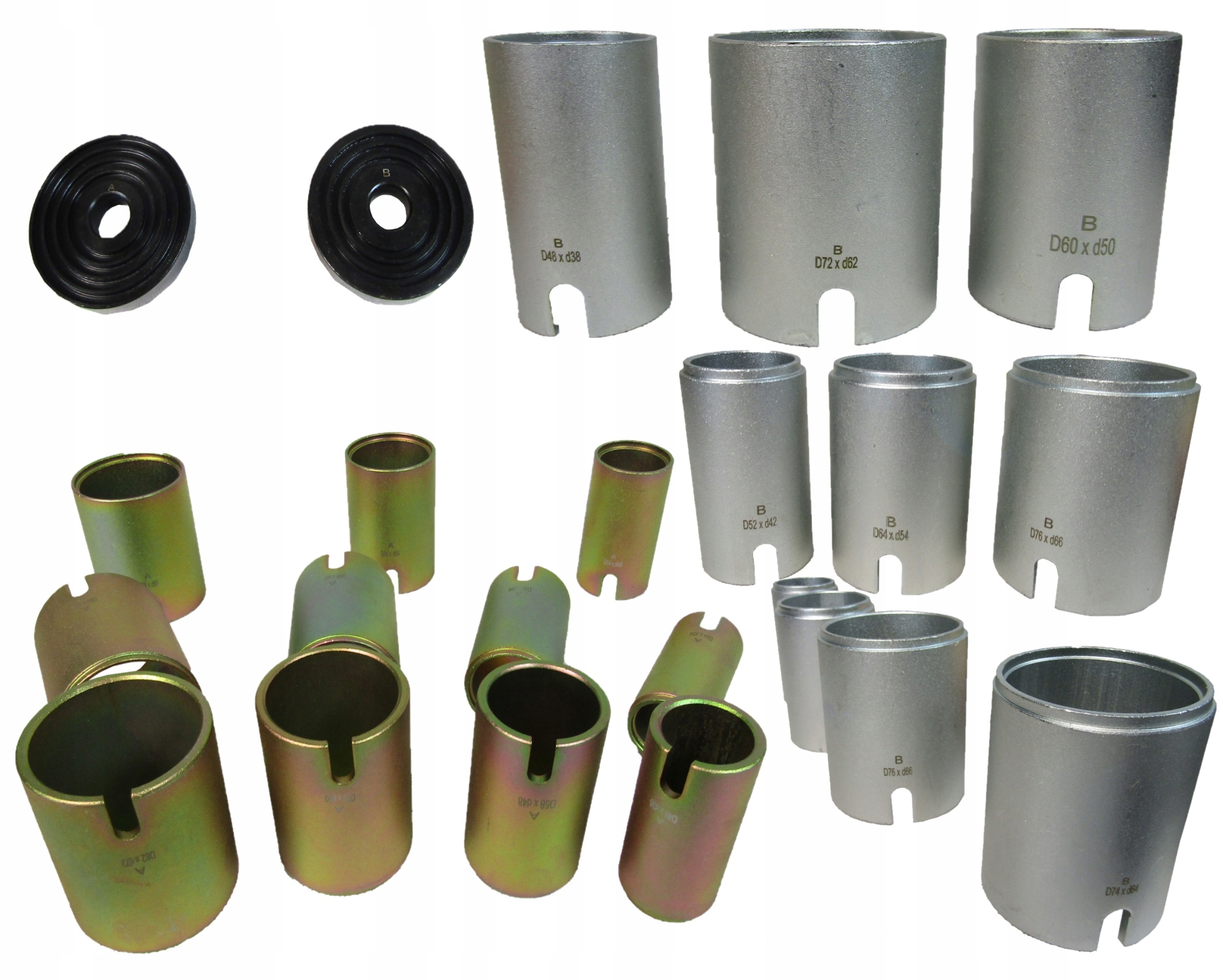 Набір для прасування/запресовування металево-гумових втулок на автомобілі без демонтажу важелів. Набір можна використовувати на гідравлічному пресі або прохідному приводі.