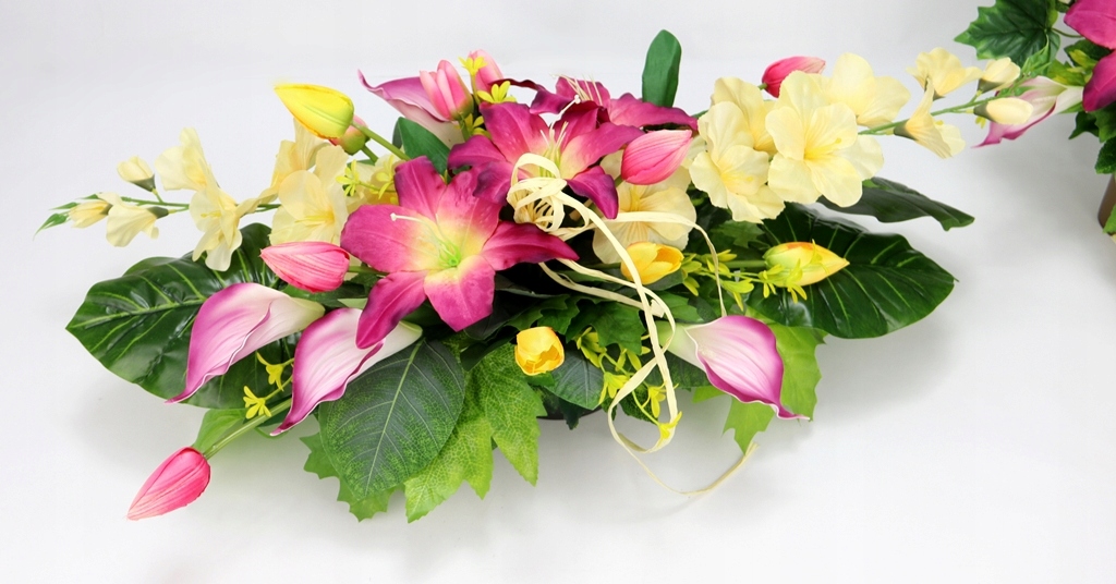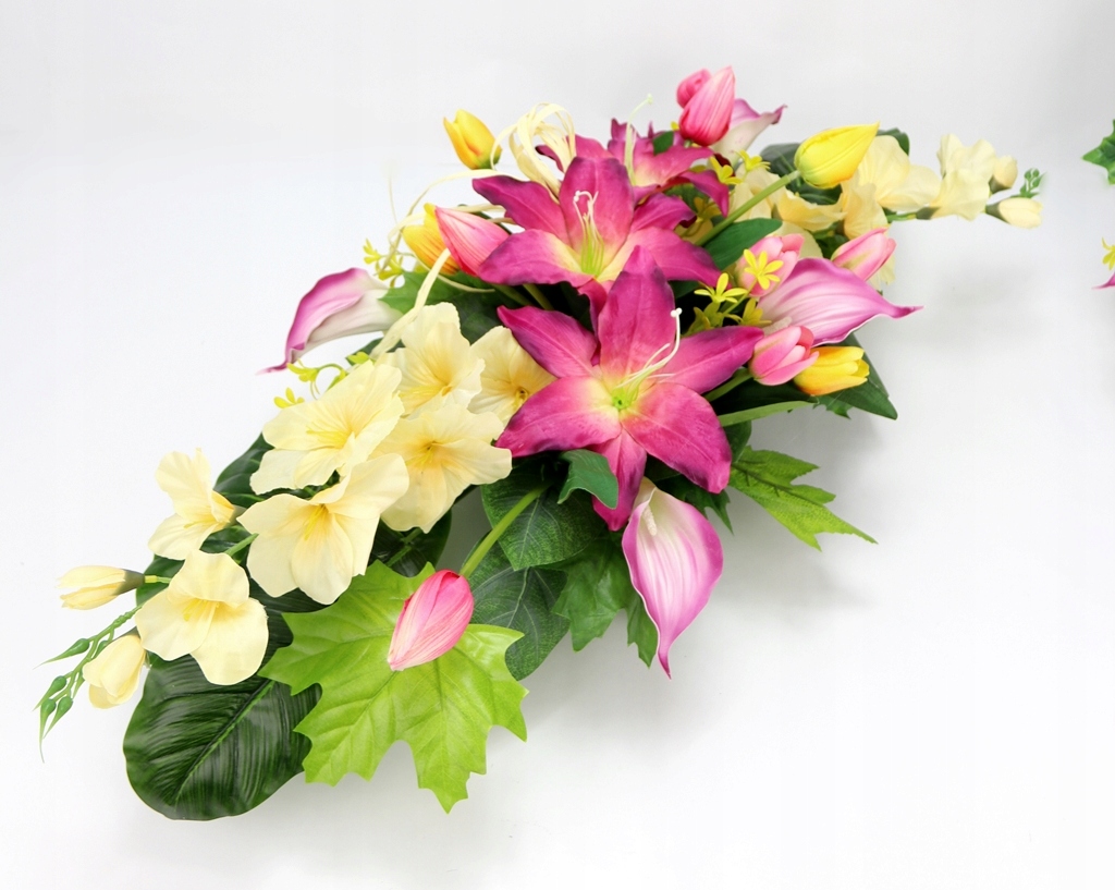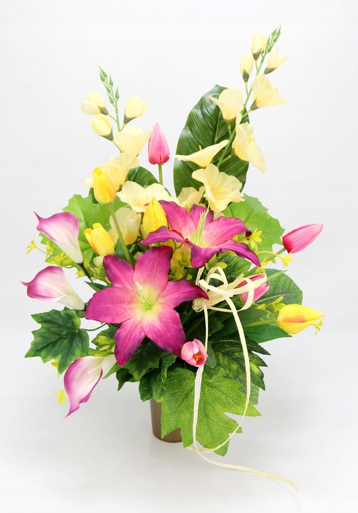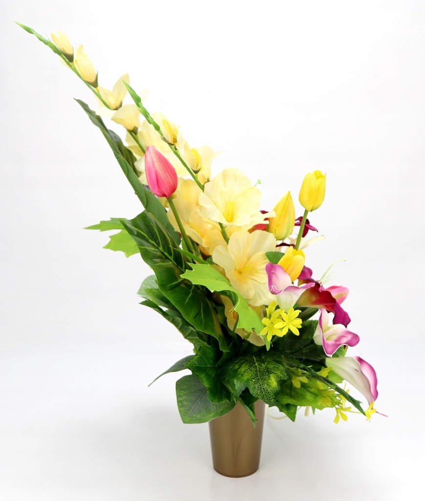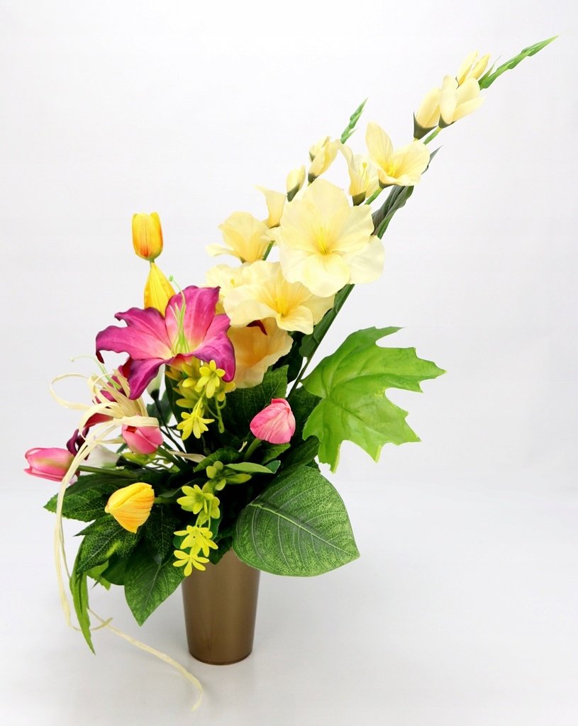 - використані штучні квіти та аксесуари: довгі атласні гладіолуси, великі лілії затінені, атласні тюльпани з бутонами різного розміру на зелених стеблах (як натуральні), пінопластові кали затінені, стебла з маленькими жовто - зеленими квіти,