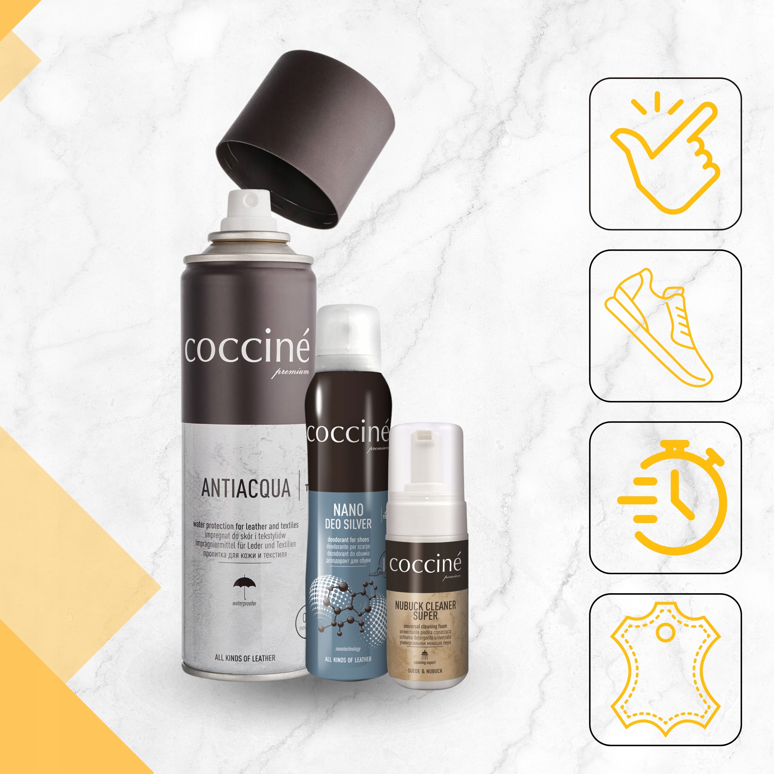 Захист взуття від вологи та бруду є запорукою її довговічності та естетичного вигляду. Coccine Antiacqua - професійне водостійке просочення, яке ефективно захищає зернисту шкіру, замшу, нубук і текстиль від вологи, бруду та пилу. Завдяки інноваційній формулі він створює невидимий гідрофобний бар’єр, не перешкоджаючи повітропроникності матеріалу, що дозволяє шкірі природним чином регулювати вологість.