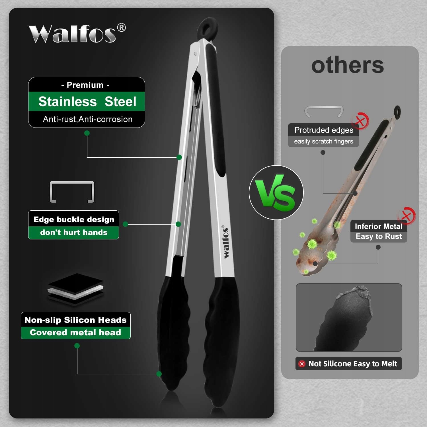 - Кухонні щипці Walfos товщиною 1,00 мм виготовлені з надзвичайно товстої нержавіючої сталі, стійкої до корозії та безпечної для харчових продуктів, товщиною 1,00 мм, вони надзвичайно міцні та високоякісні, але легкі та прості у використанні. Це дозволяє легко схопити товстий стейк, смажену курку або салат. Легко чистити та легко тримати